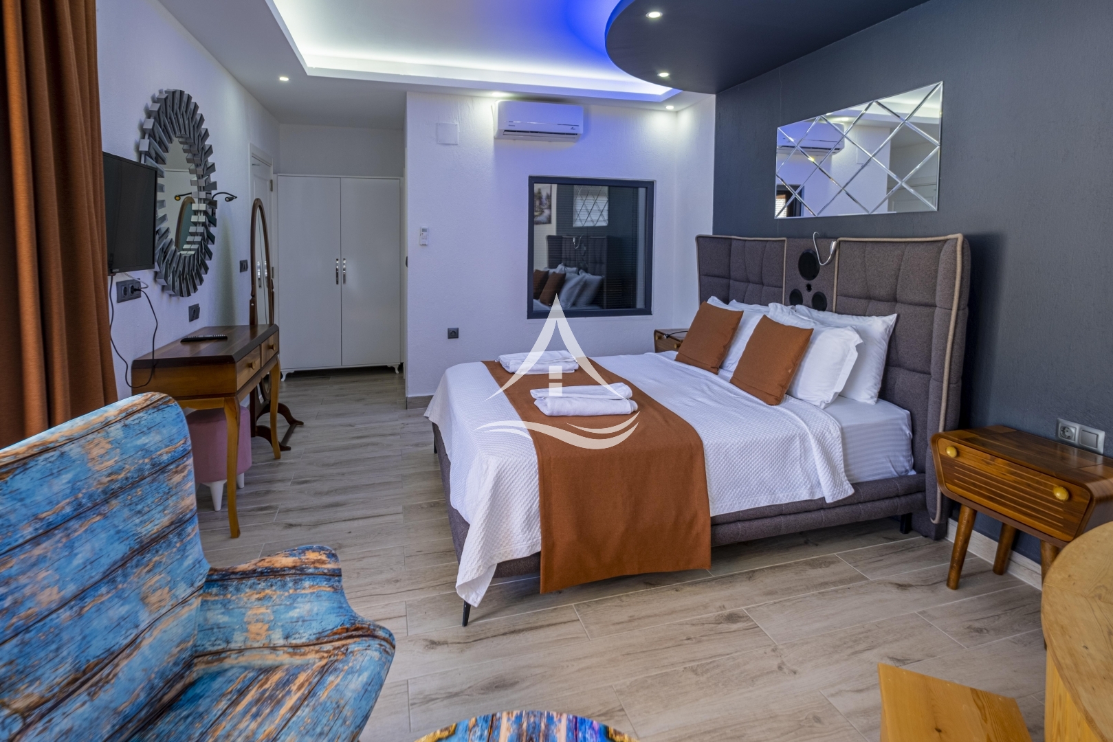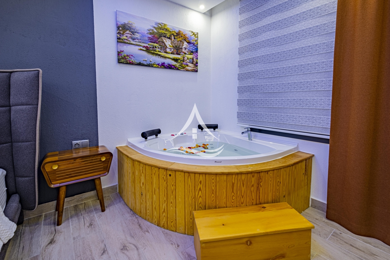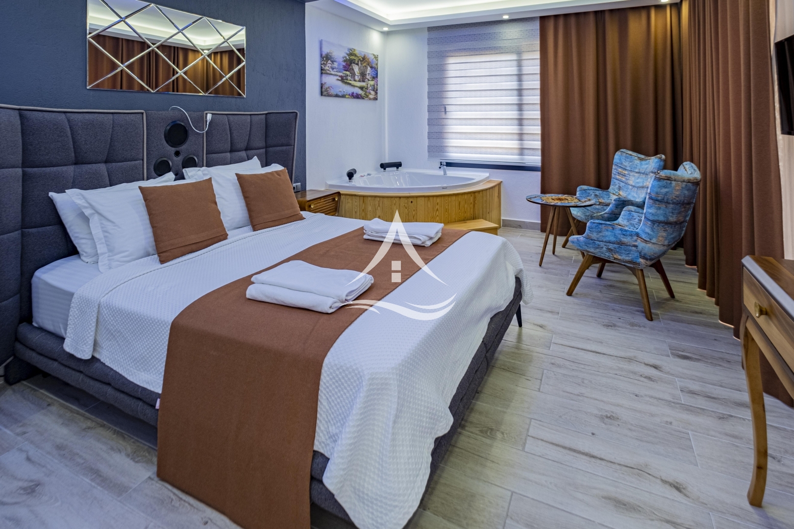 1. Yatak Odası : 1 Adet Çift Kişilik Yatak, Klima, Komodin, Elbise dolabı, Jakuzi, Ebeveyn banyo