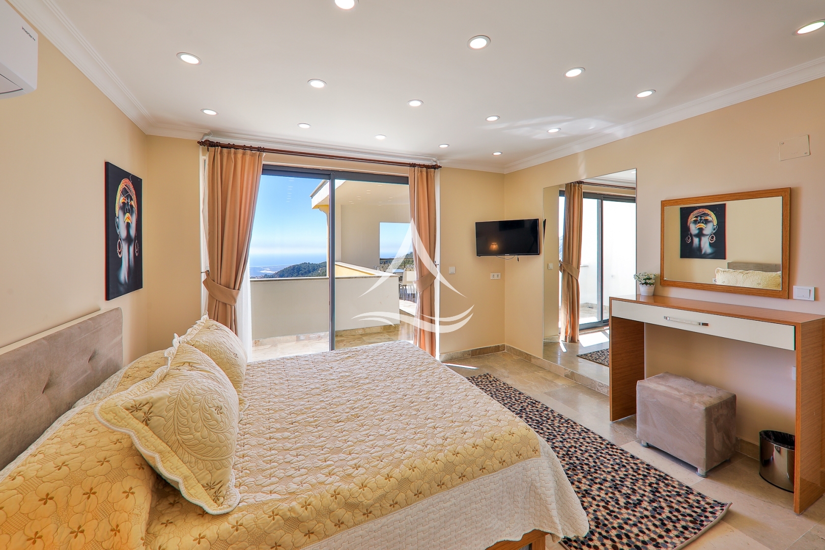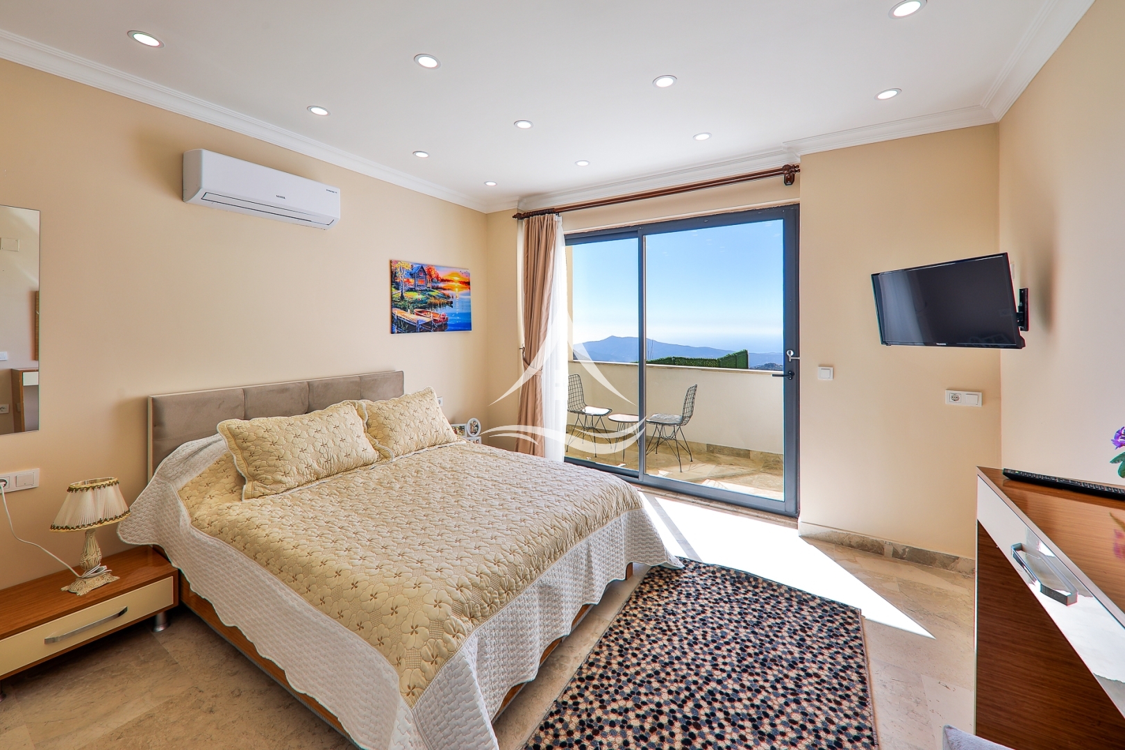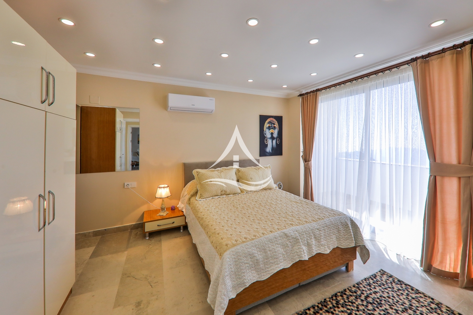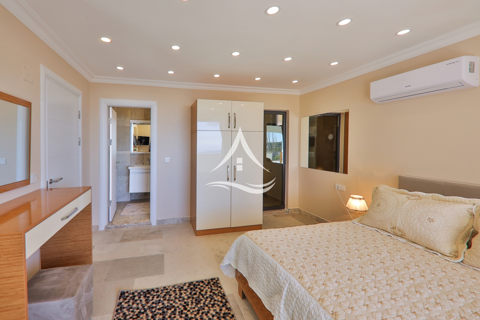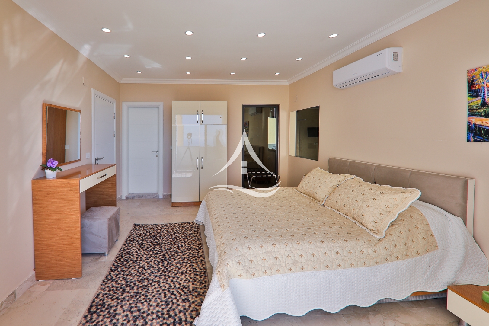 2.Yatak Odası : 1 Adet Çift Kişilik Yatak, Klima , Komodin , Elbise Dolabı, Makyaj Masası, TV, Ebeveyn Banyo
