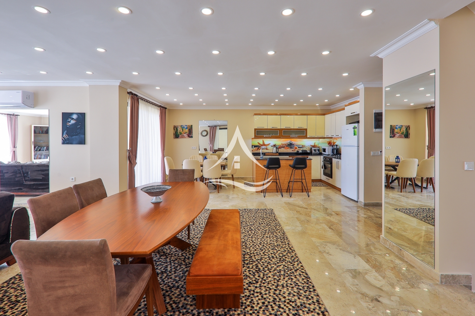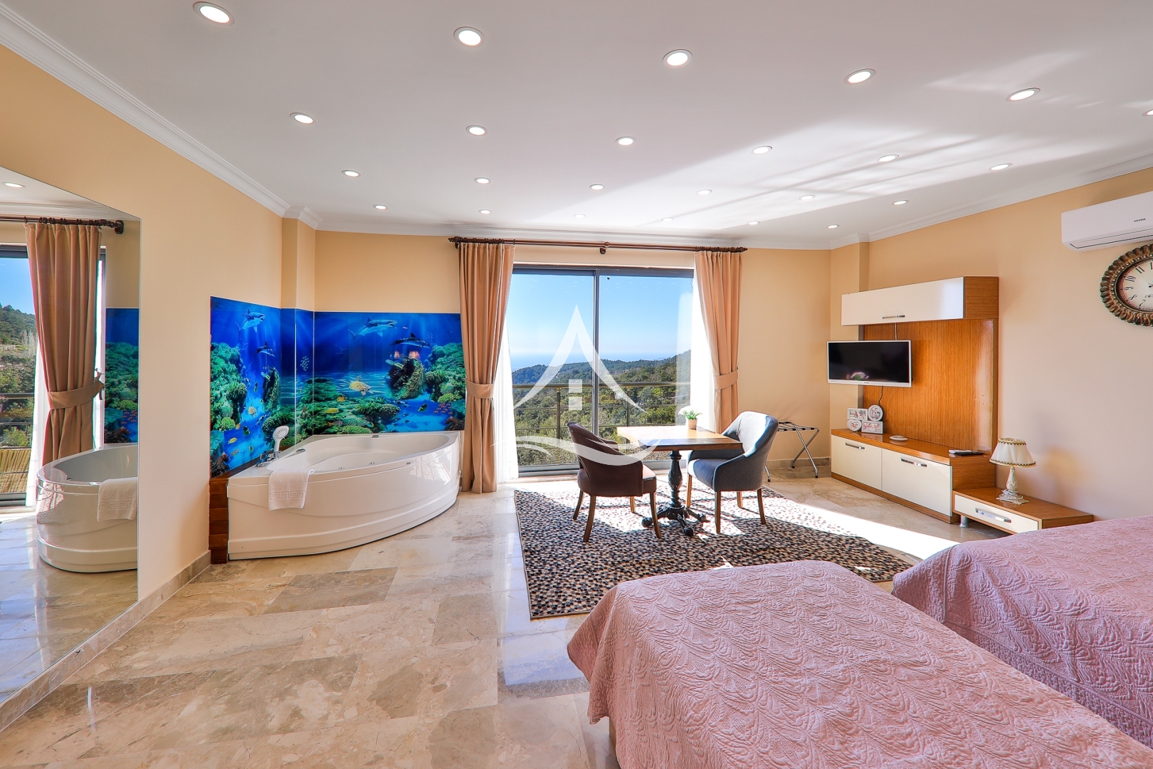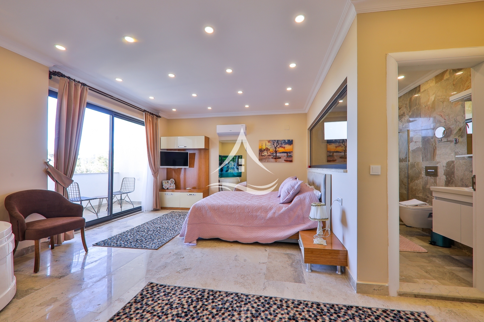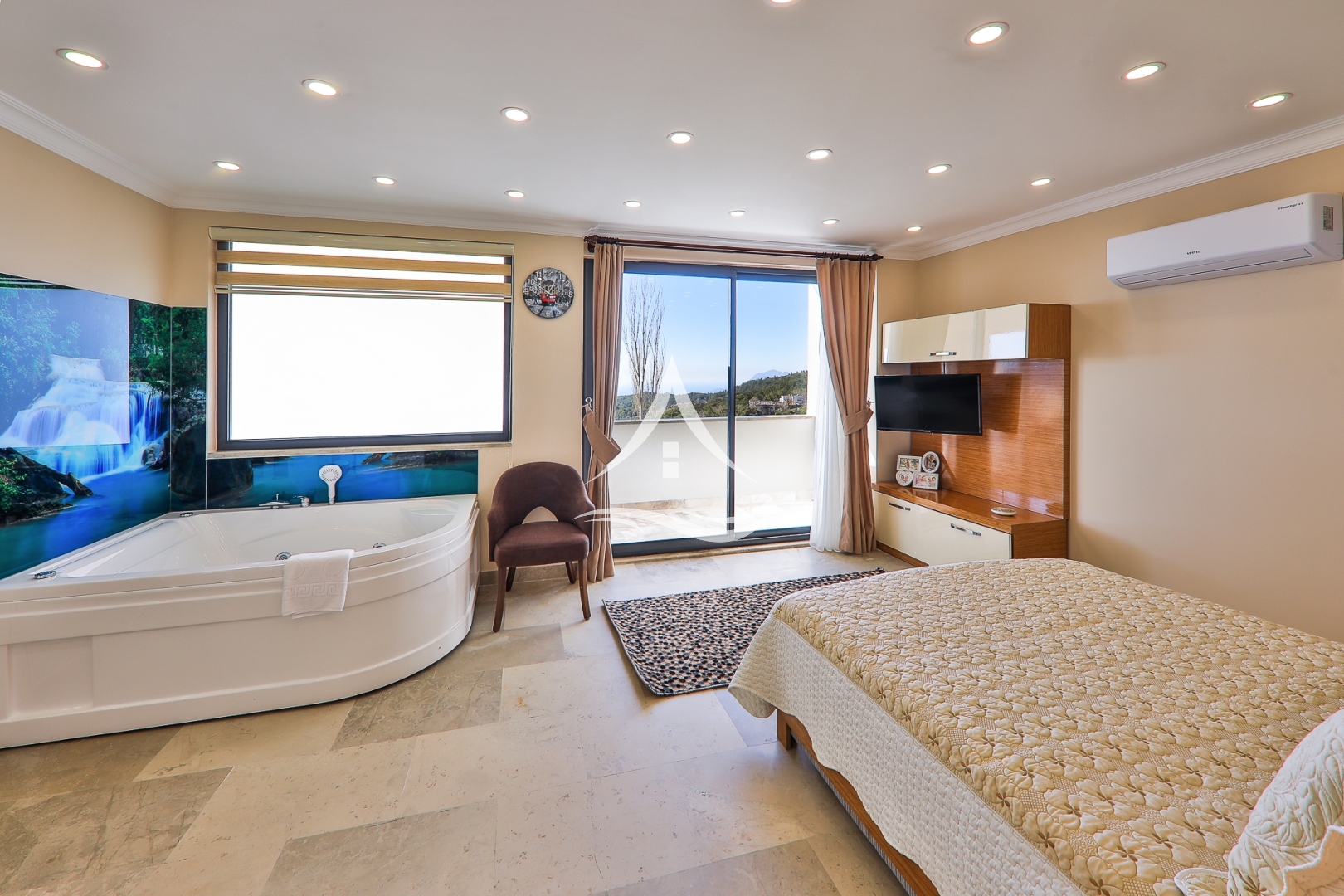 1. Yatak Odası : 1 Adet Çift Kişilik Yatak, Klima , Komodin , Elbise Dolabı, Makyaj Masası, TV, Ebeveyn Banyo, Jakuzi