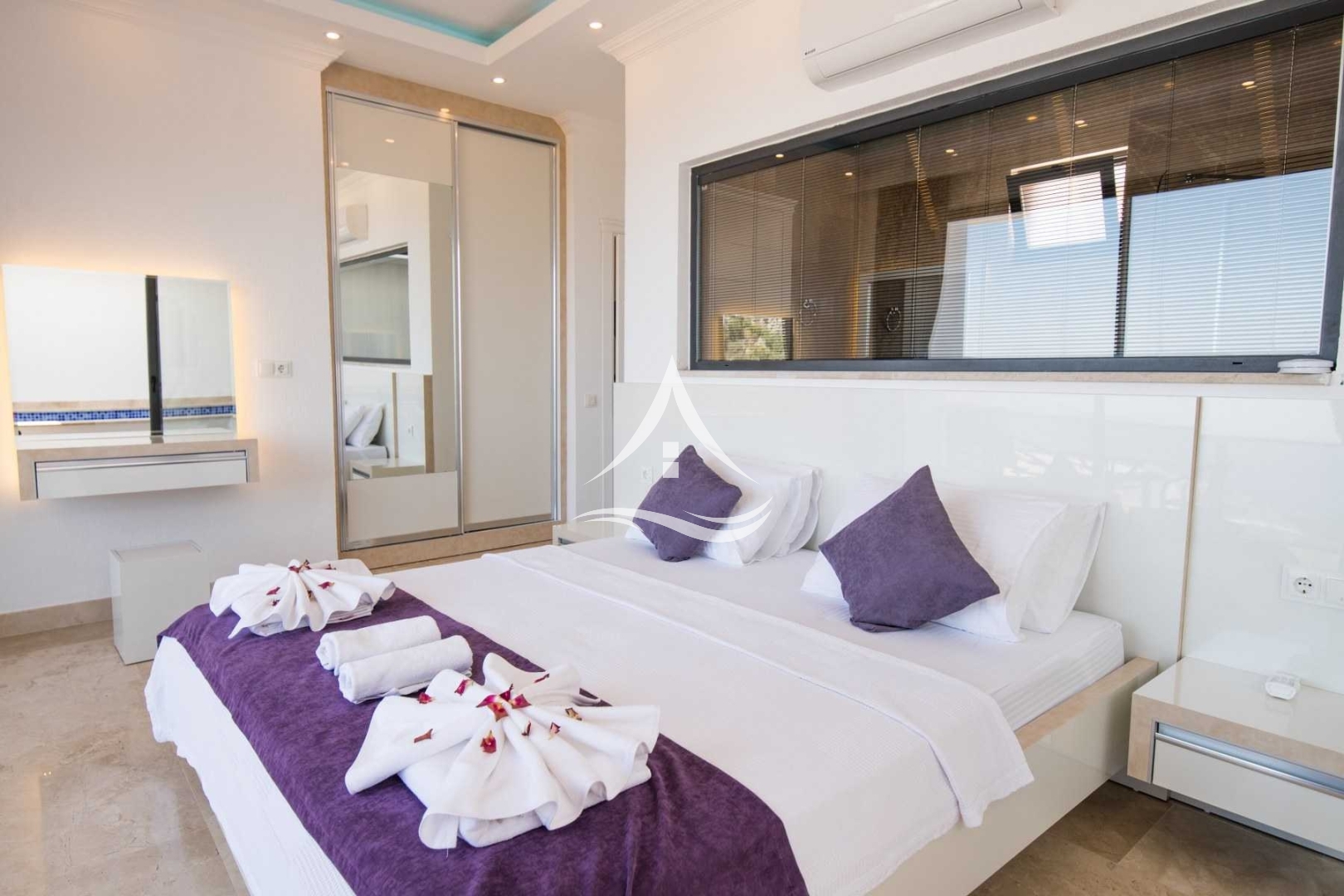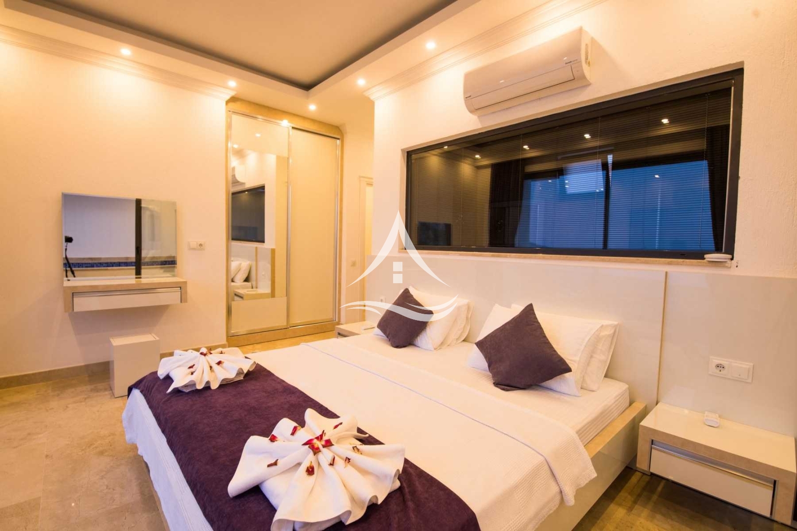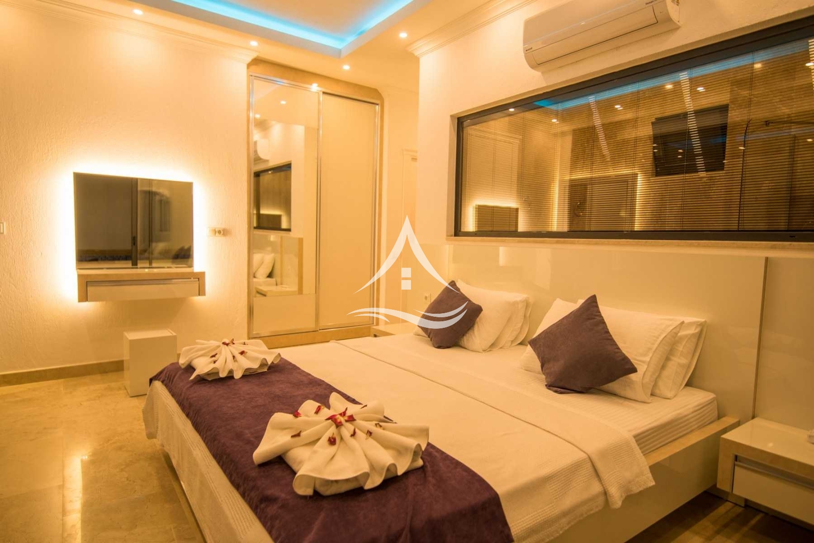 1. Yatak Odası : 1 Adet Çift Kişilik Yatak, Klima, Tv, Ebeveyn Banyo