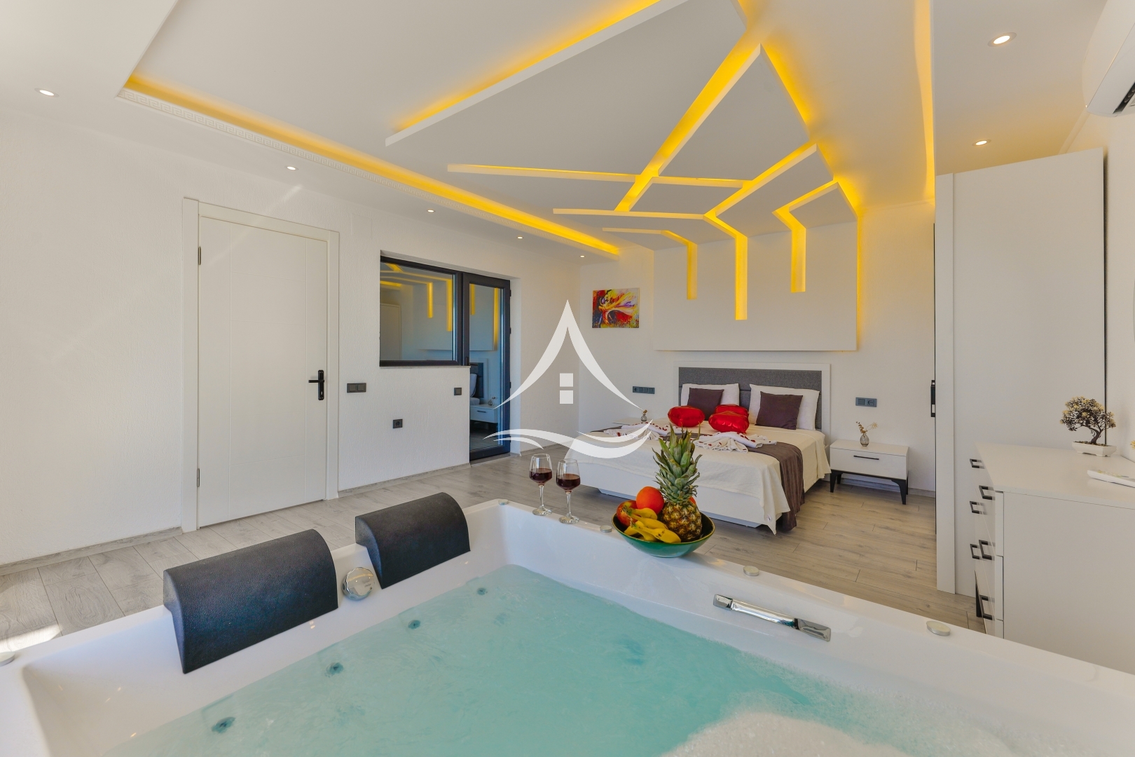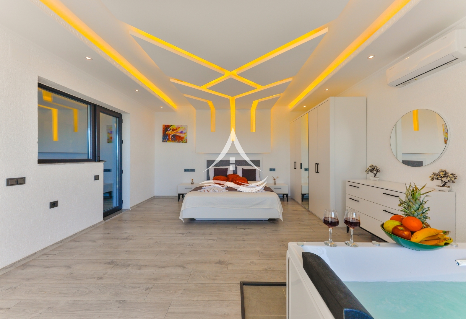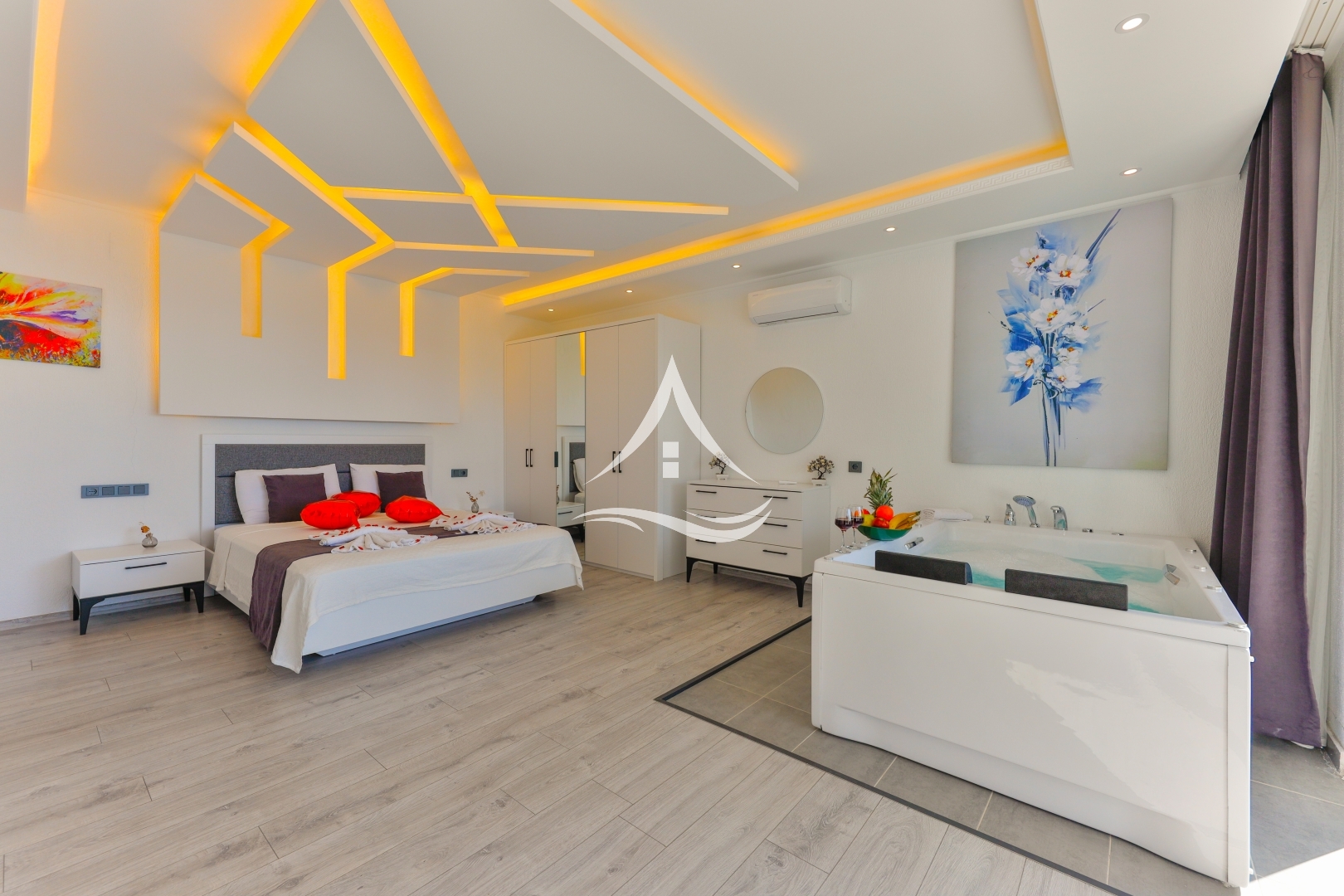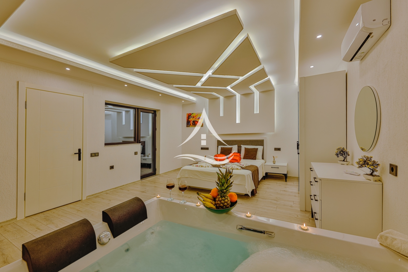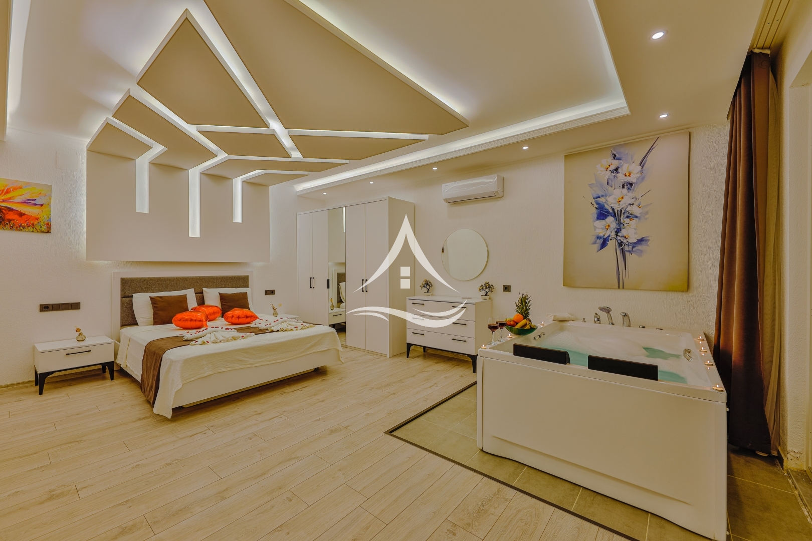 1. Yatak Odası : 1 Adet Çift Kişilik Yatak, Elbise Dolabı, Berjer ,  Klima, Komodin , Ebeveyn Banyo , Jakuzi