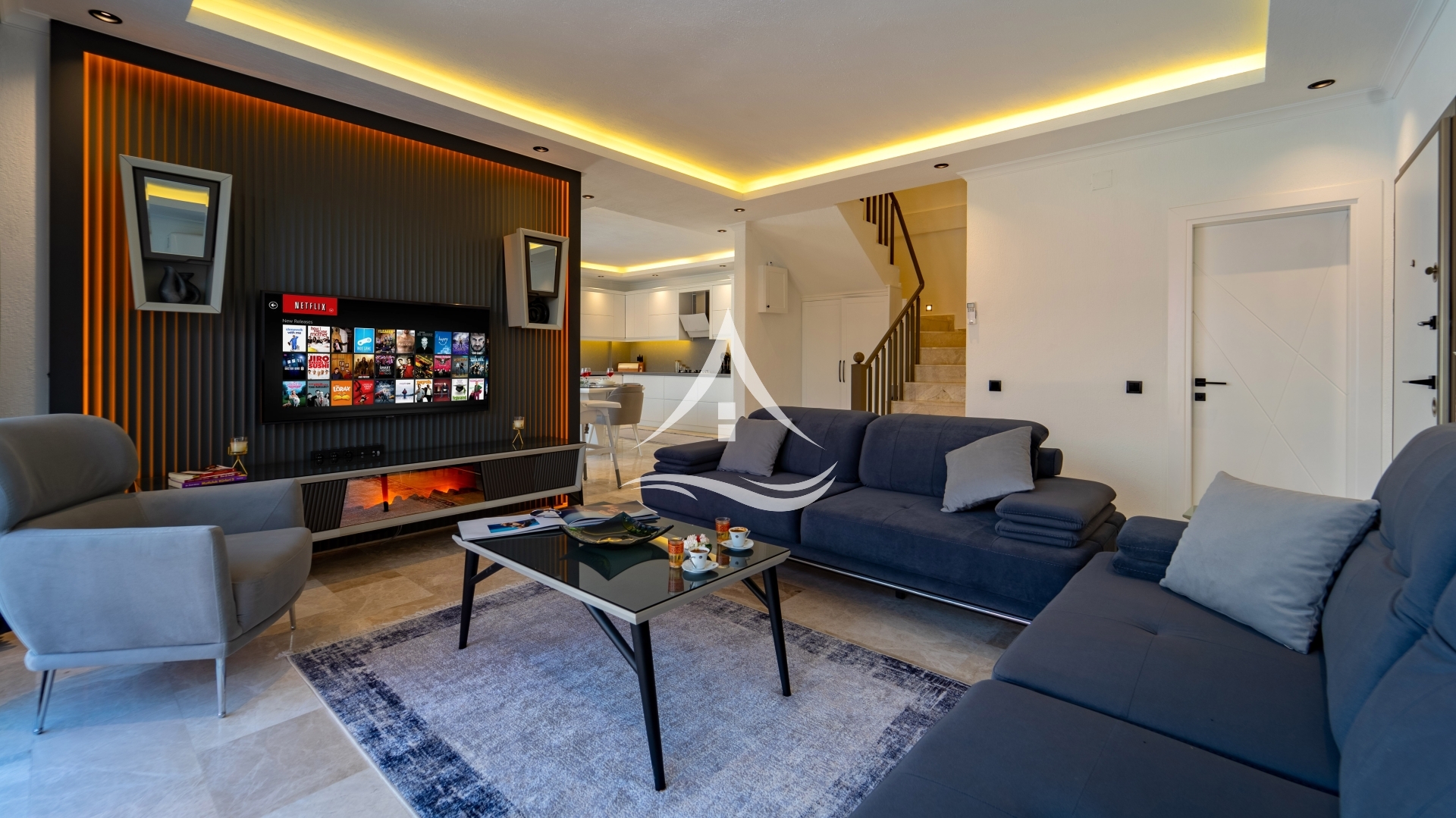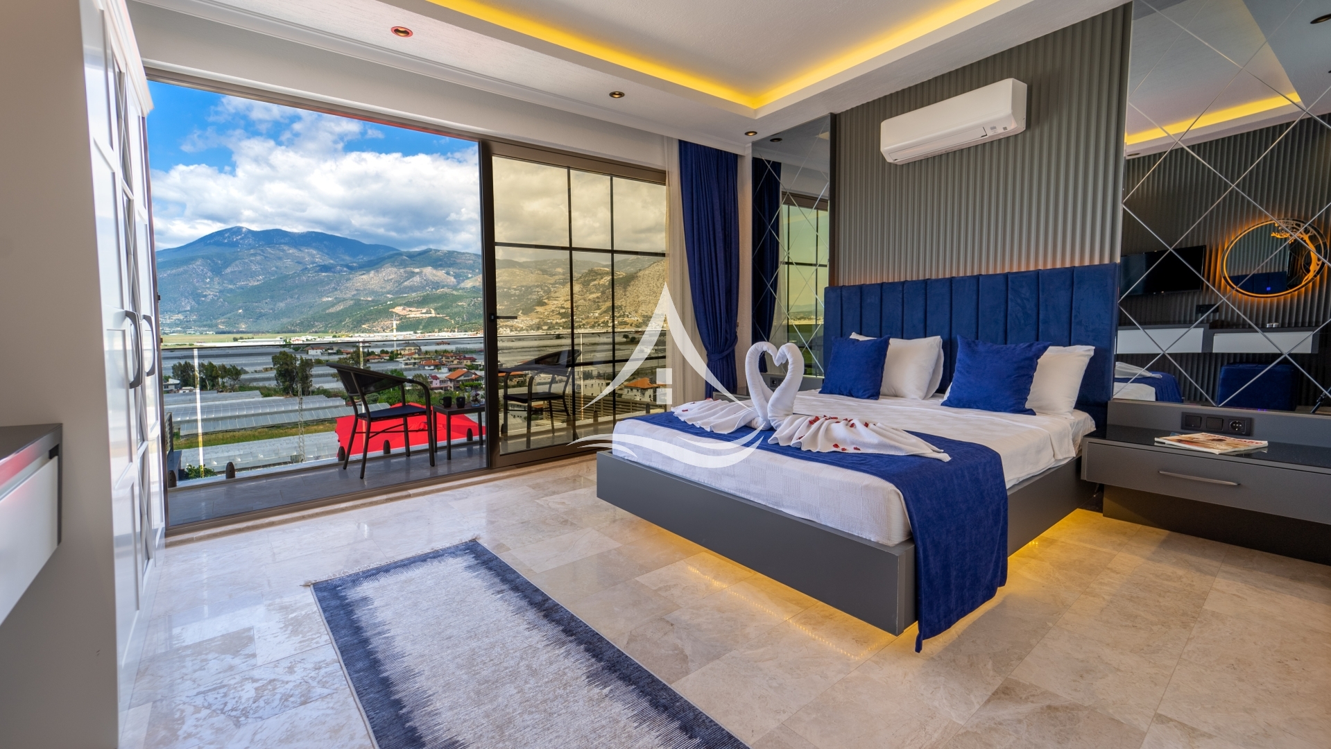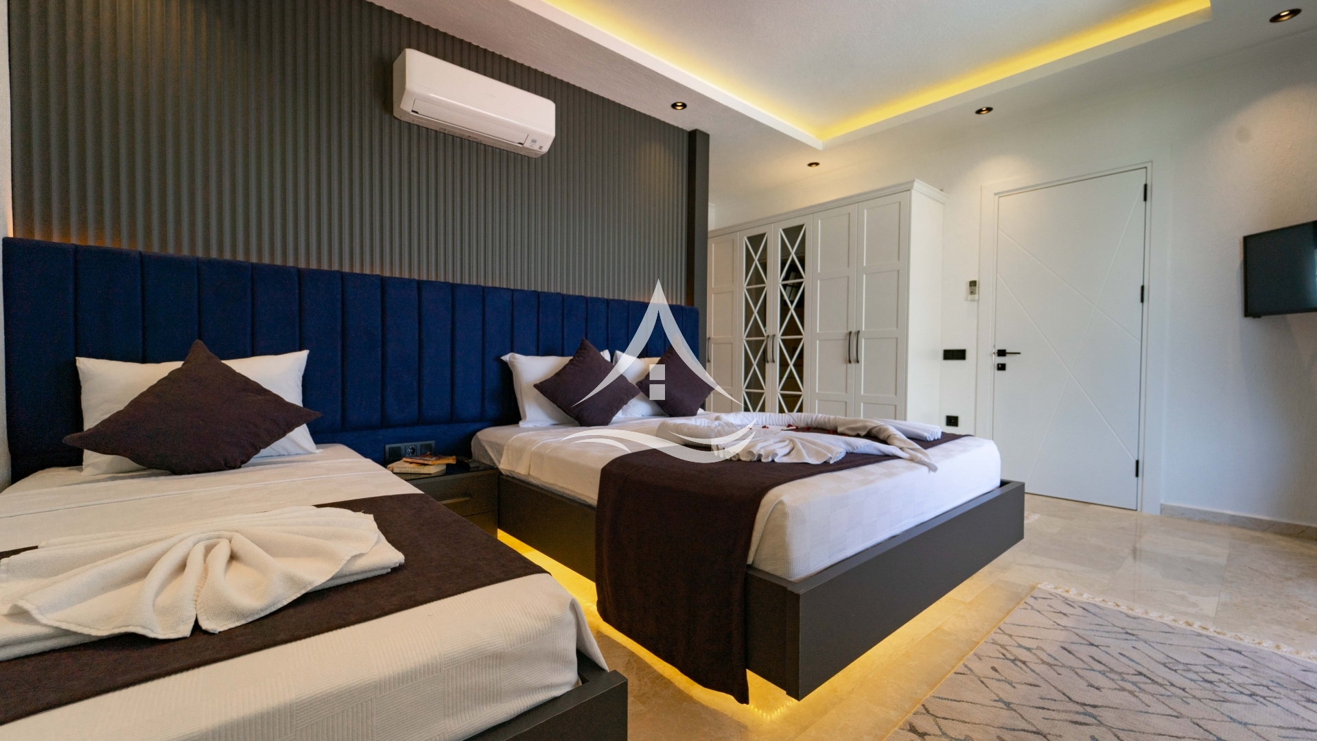 1. Yatak Odası : 1 Adet Çift Kişilik Yatak, Klima, Komodin, Elbise Dolabı, TV, Makyaj Masası, Ebeveyn Banyo ,Jakuzi