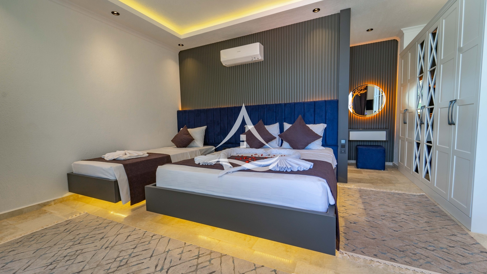 2. Yatak Odası : 1 Adet Çift Kişilik Yatak, 1 Adet Tek Kişilik Yatak ,Klima, Komodin, Elbise Dolabı, Makyaj Masası ,TV, Ebeveyn Banyo