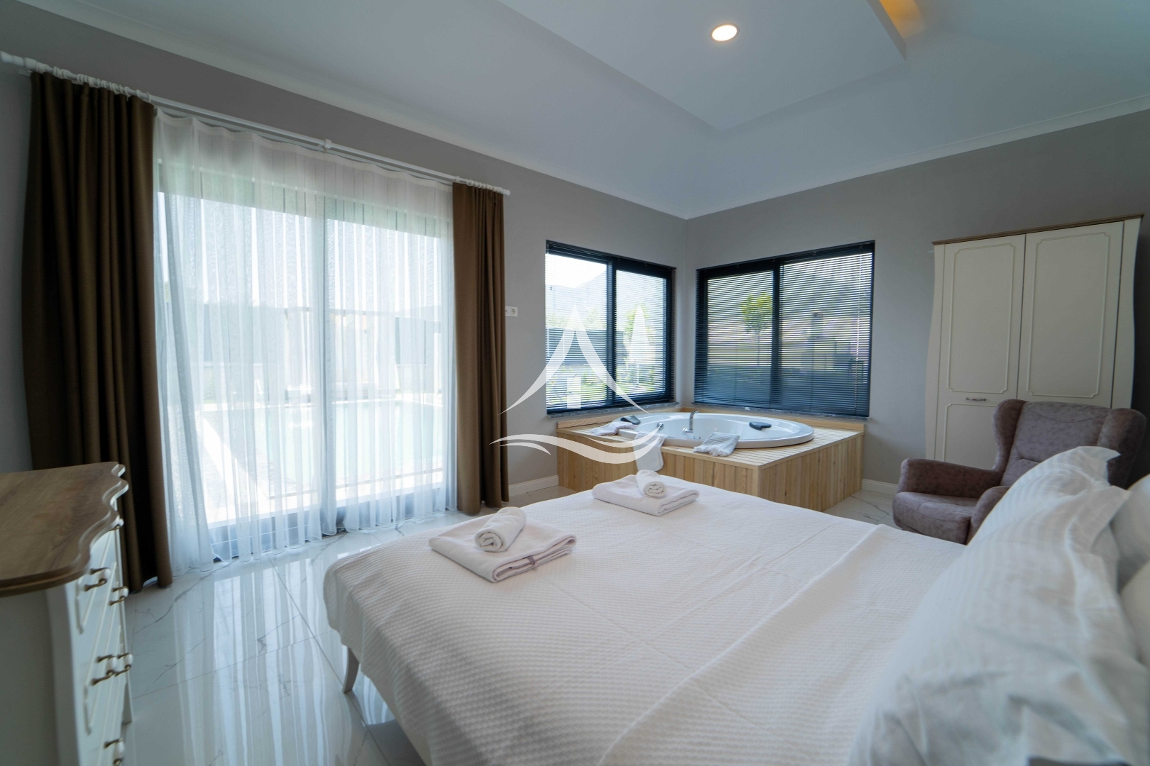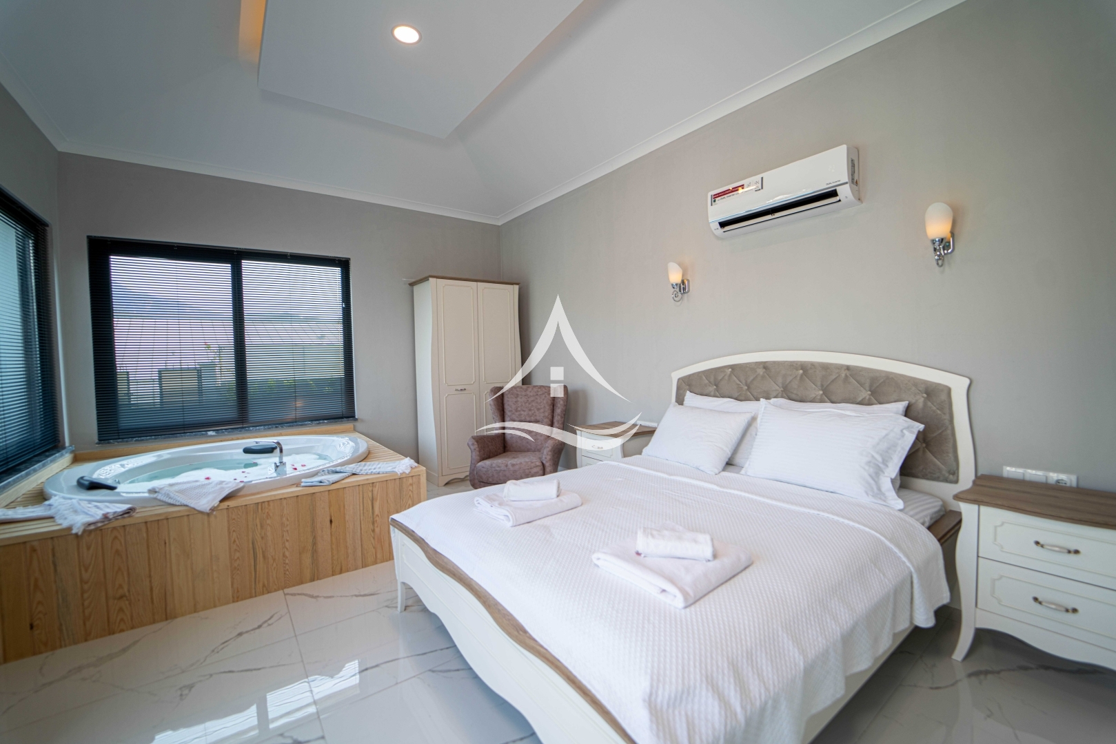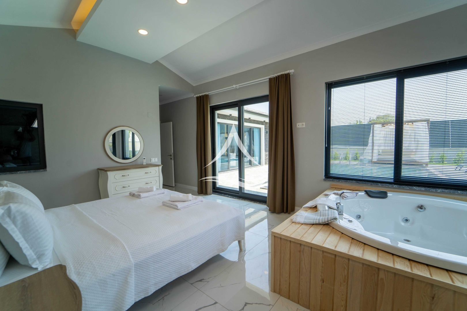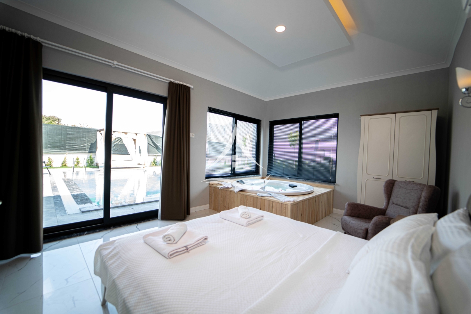 1. Yatak Odası : 1 Adet Çift Kişilik Yatak, Klima, Ebeveyn Banyo, Jakuzi, Havuz Terasına Çıkış