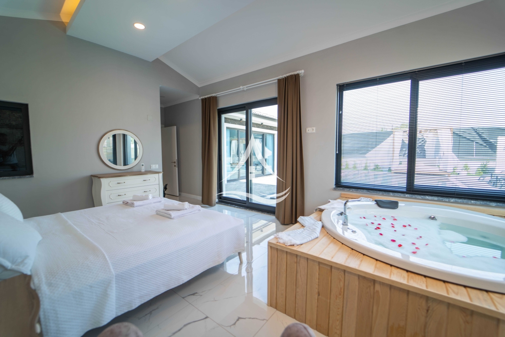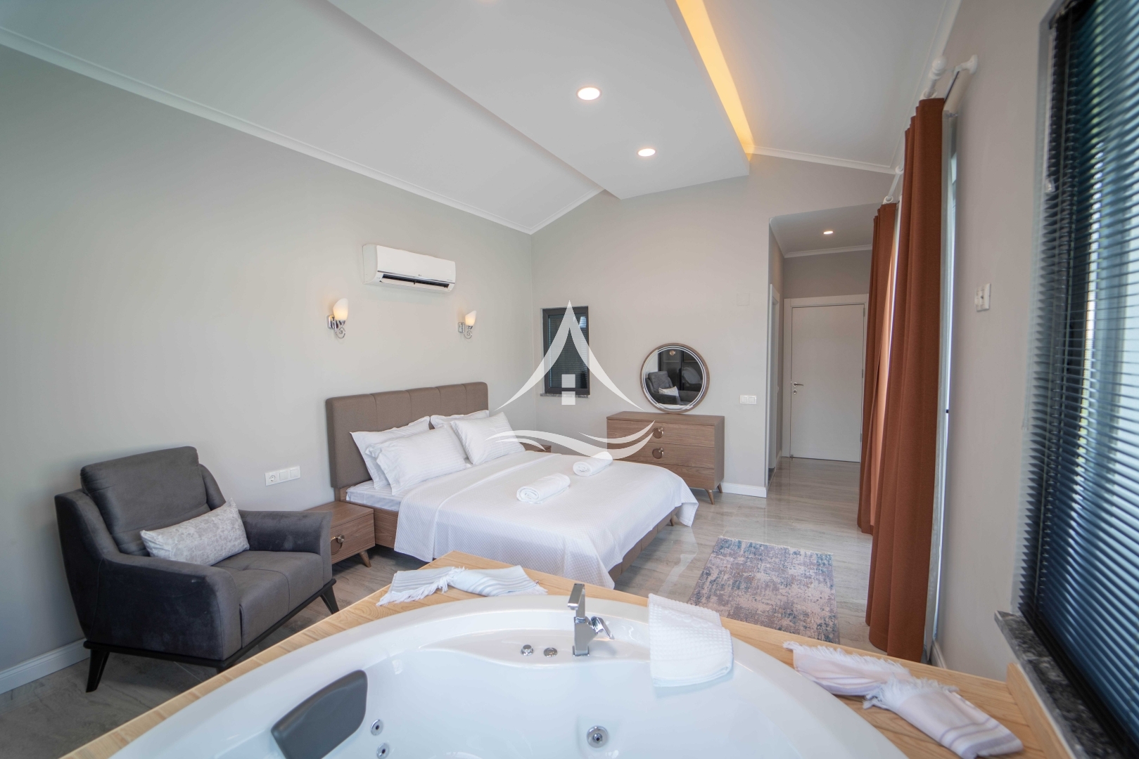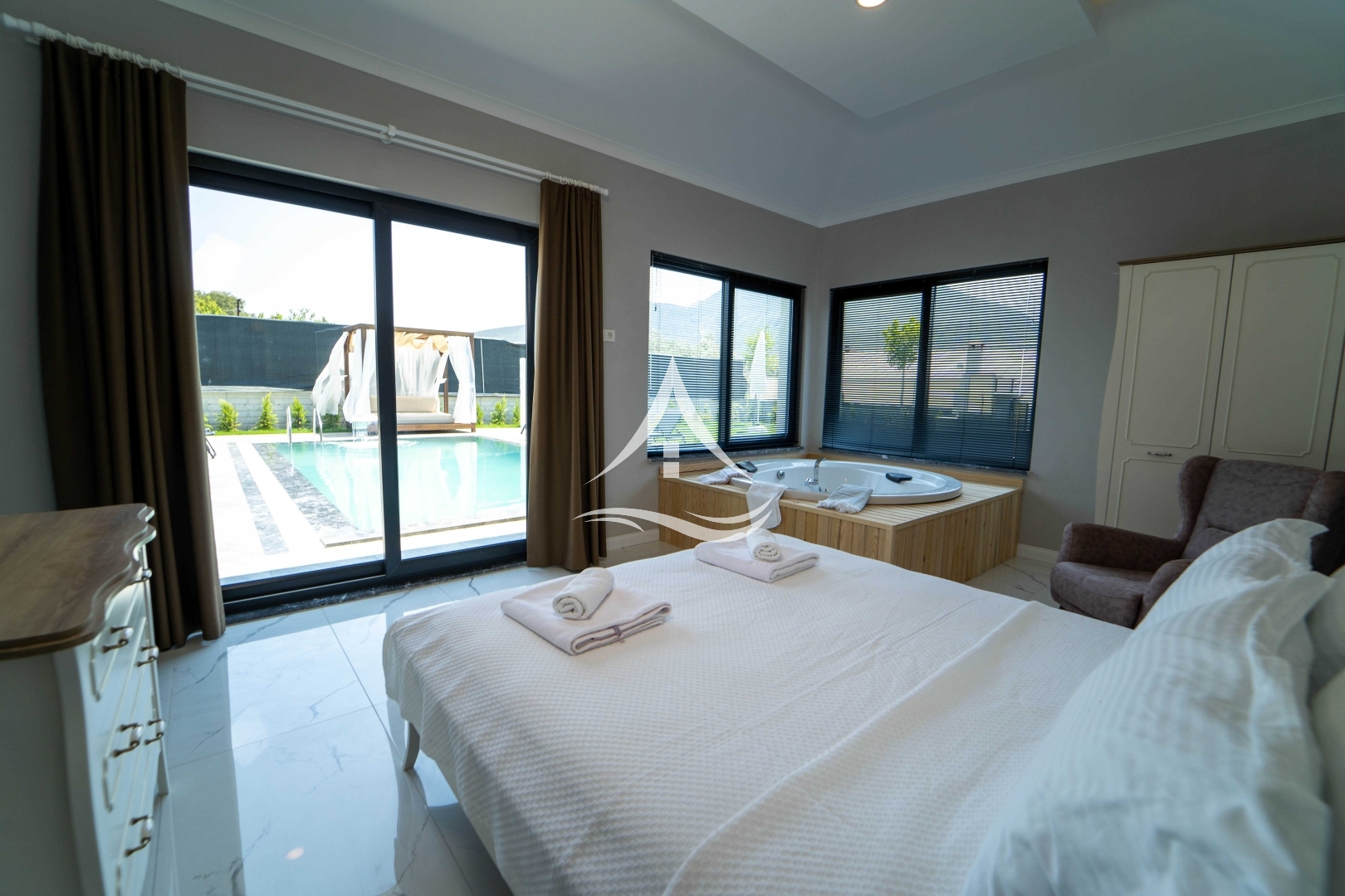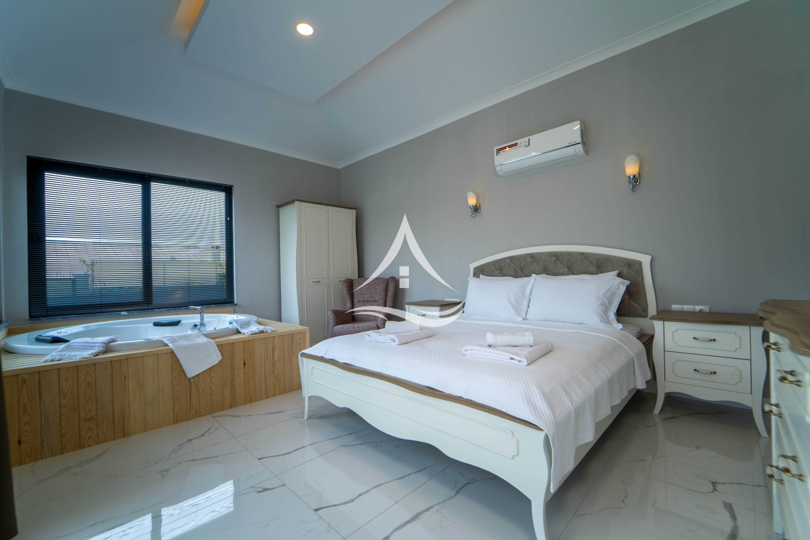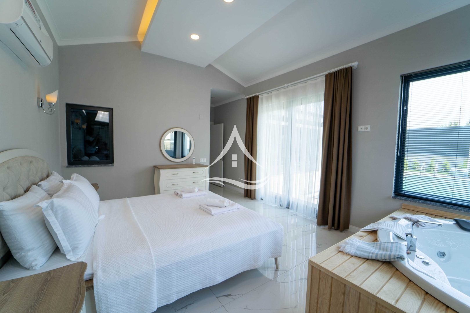 1. Yatak Odası : 1 Adet Çift Kişilik Yatak, Klima, Ebeveyn Banyo, Jakuzi, Havuz Terasına Çıkış
