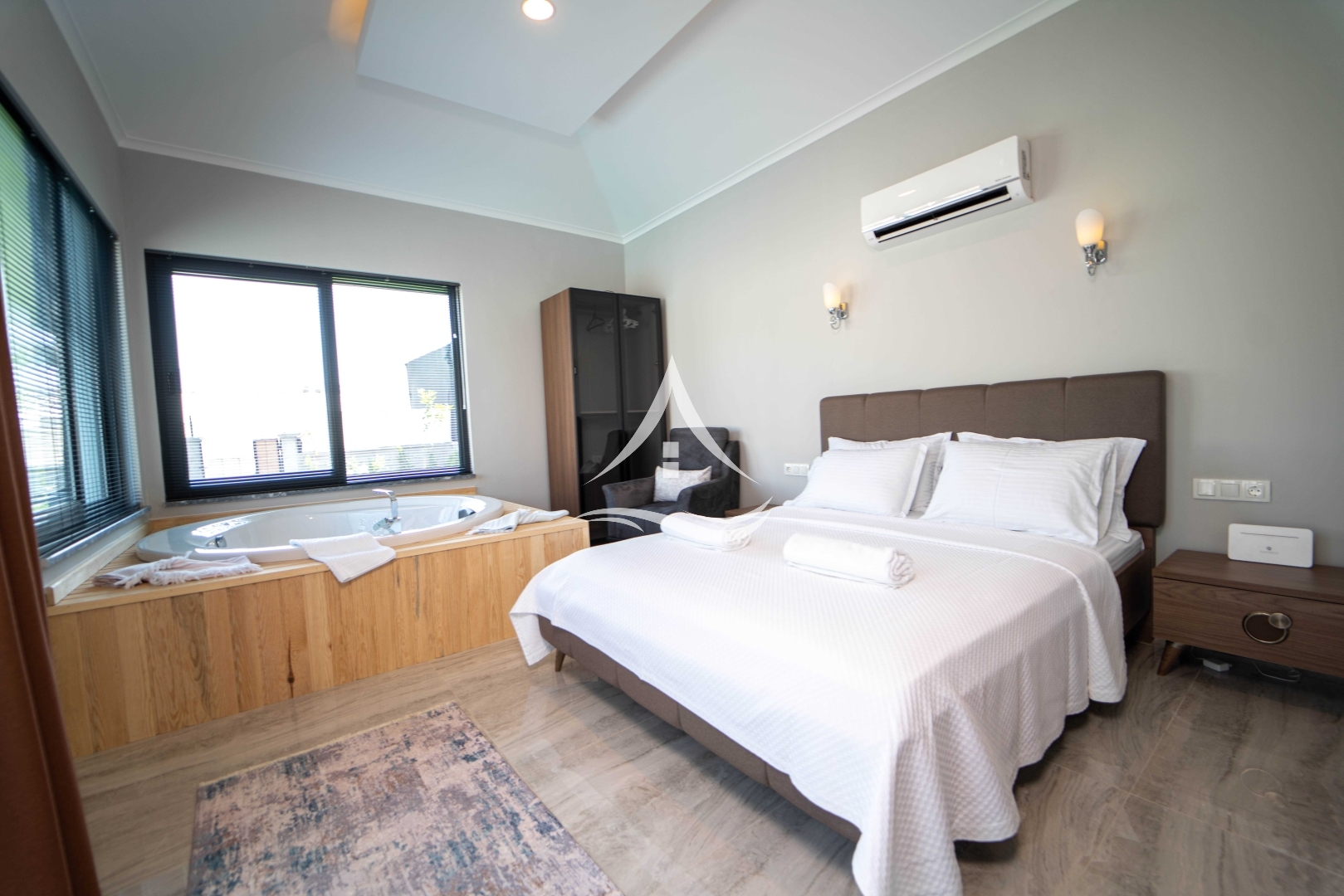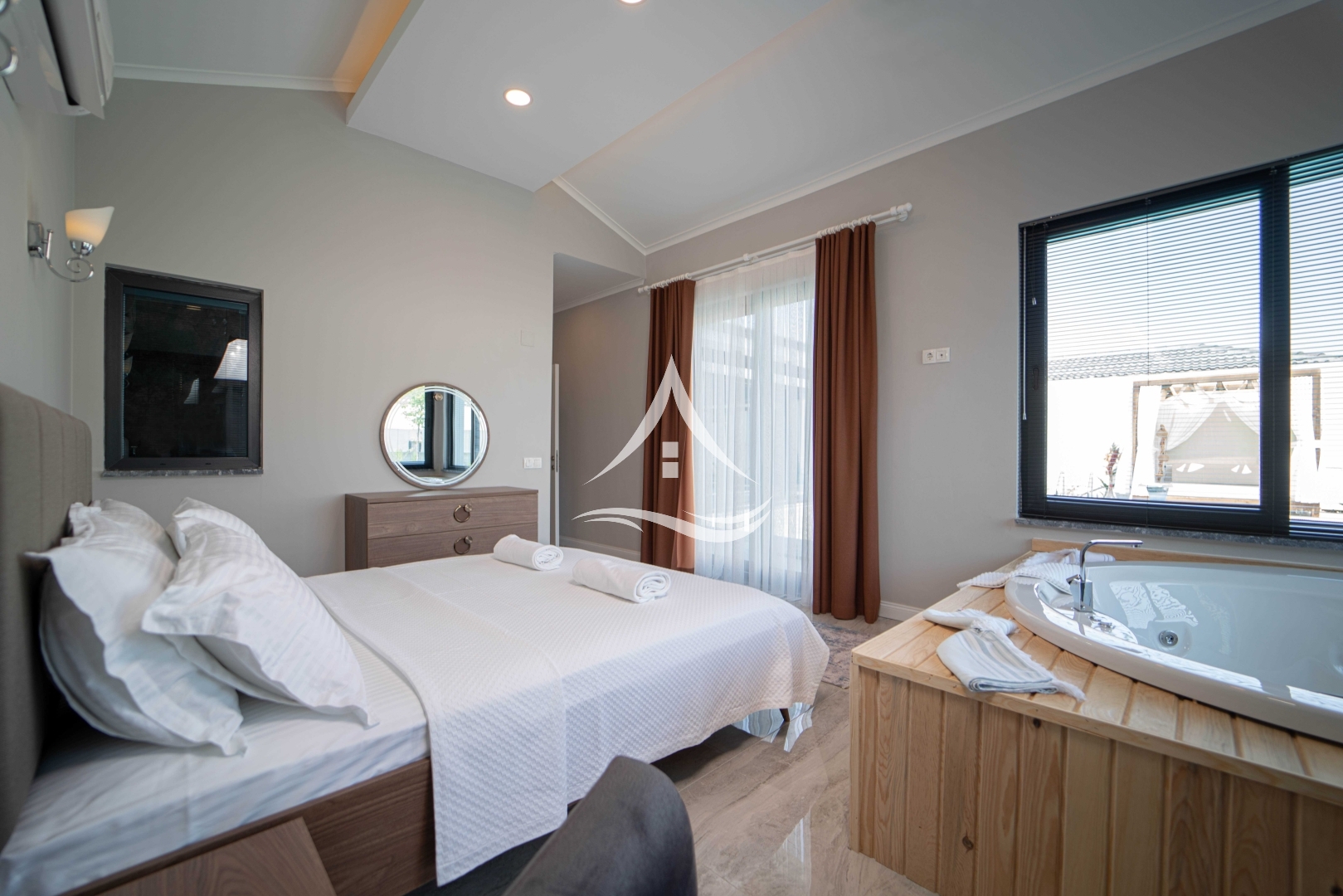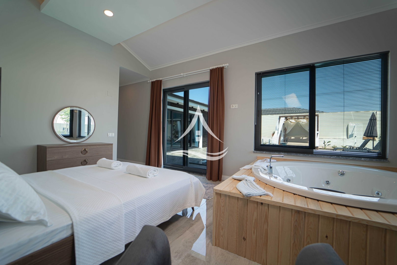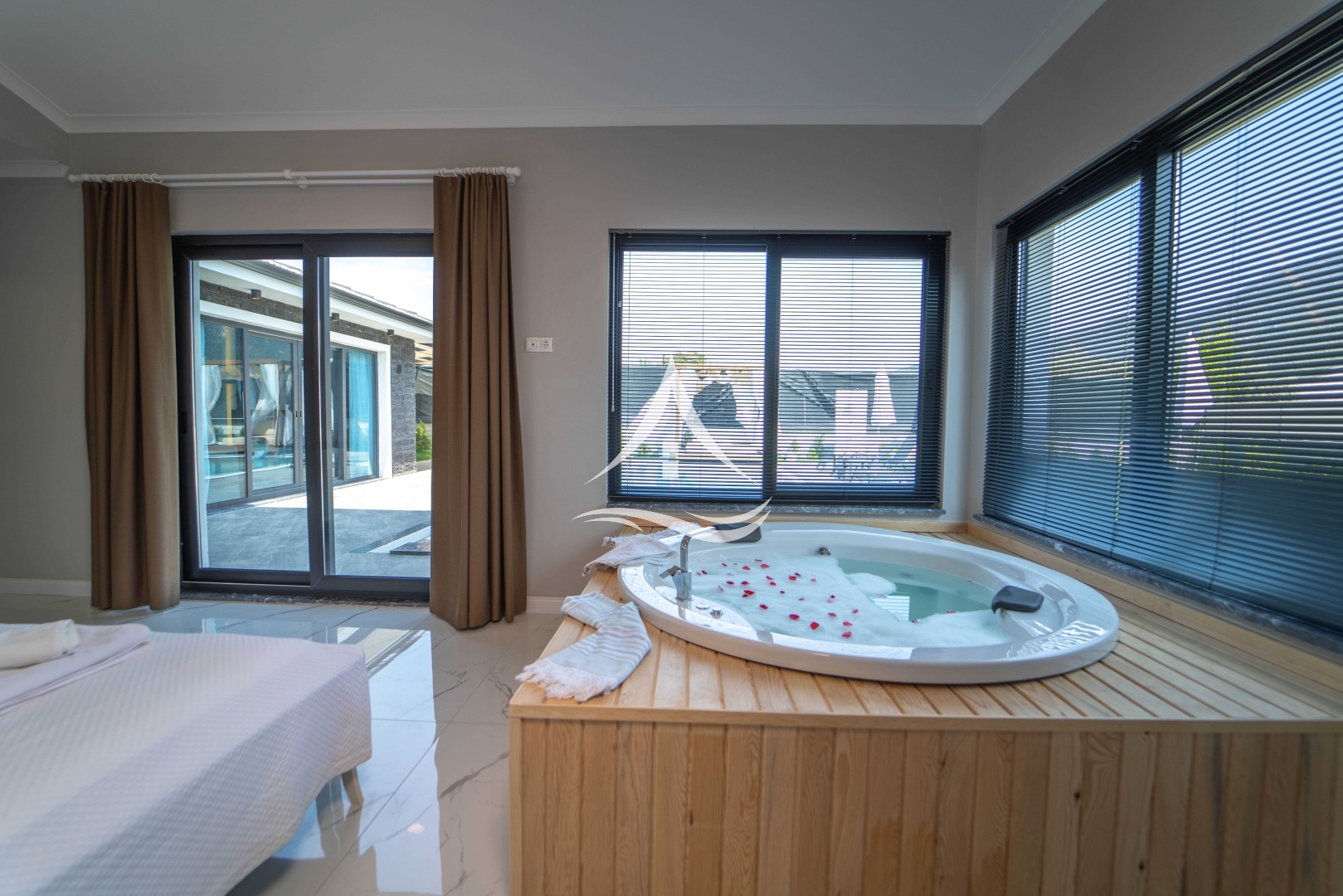 1. Yatak Odası : 1 Adet Çift Kişilik Yatak, Klima, Ebeveyn Banyo, Jakuzi, Havuz Terasına Çıkış