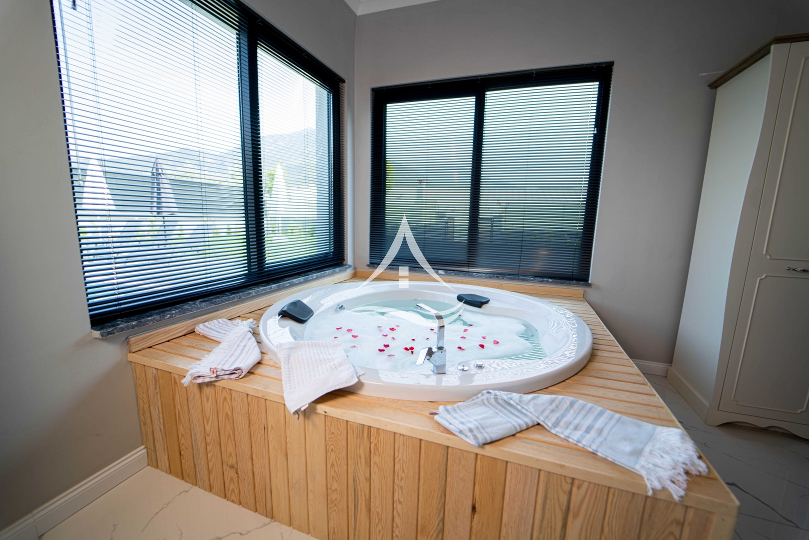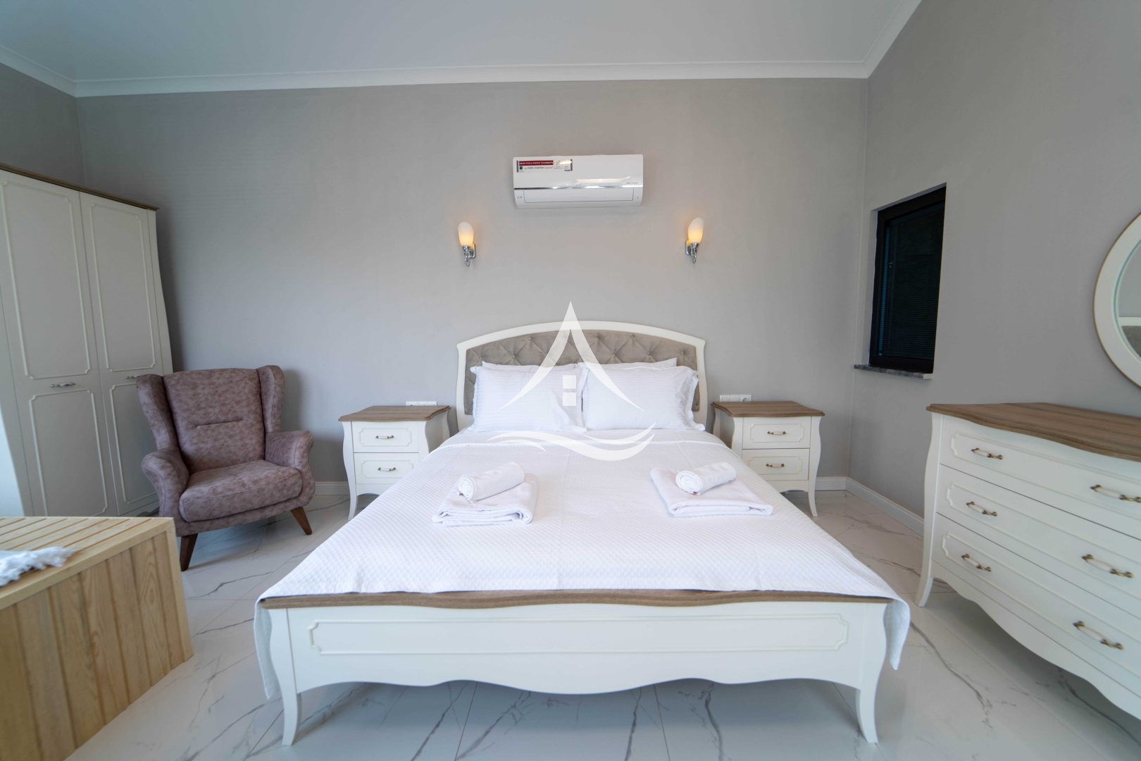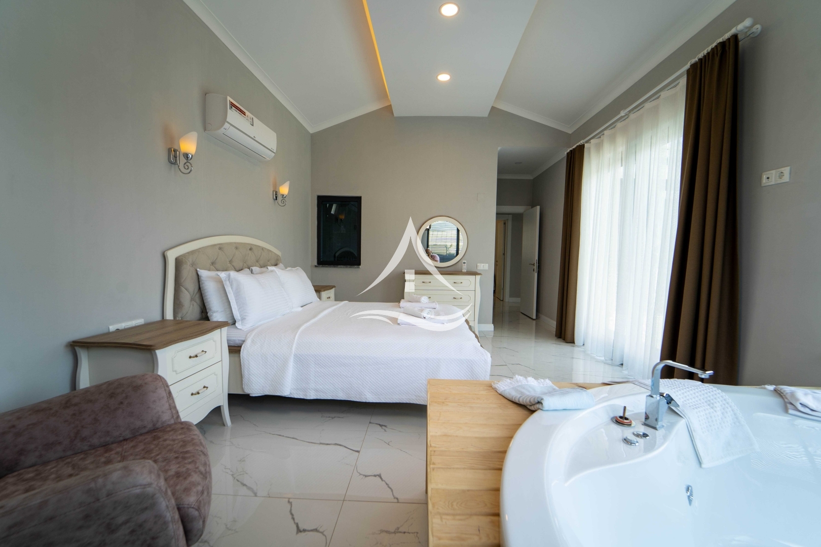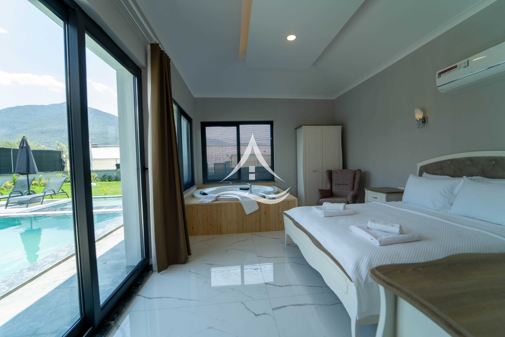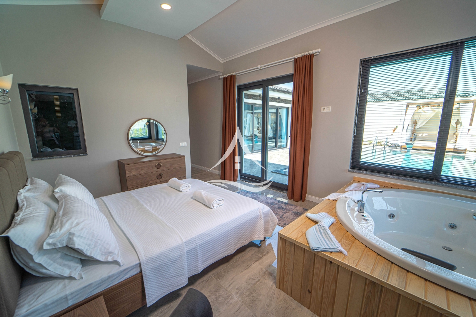 1. Yatak Odası : 1 Adet Çift Kişilik Yatak, Klima, Ebeveyn Banyo, Jakuzi, Havuz Terasına Çıkış