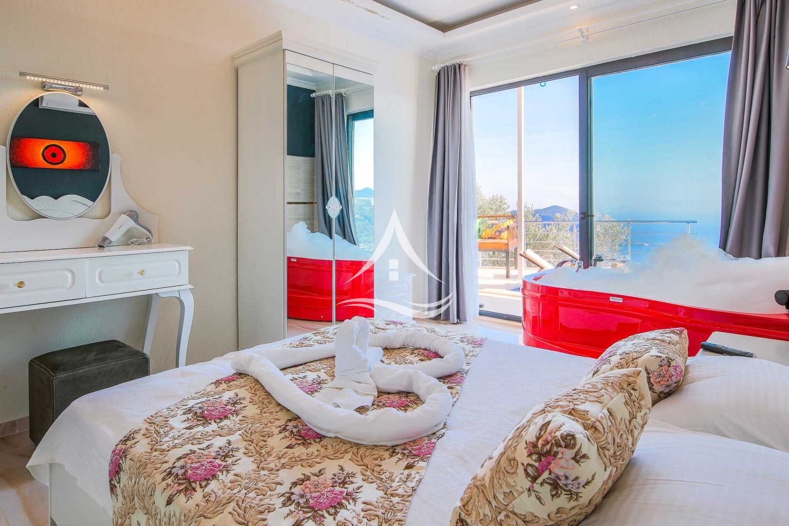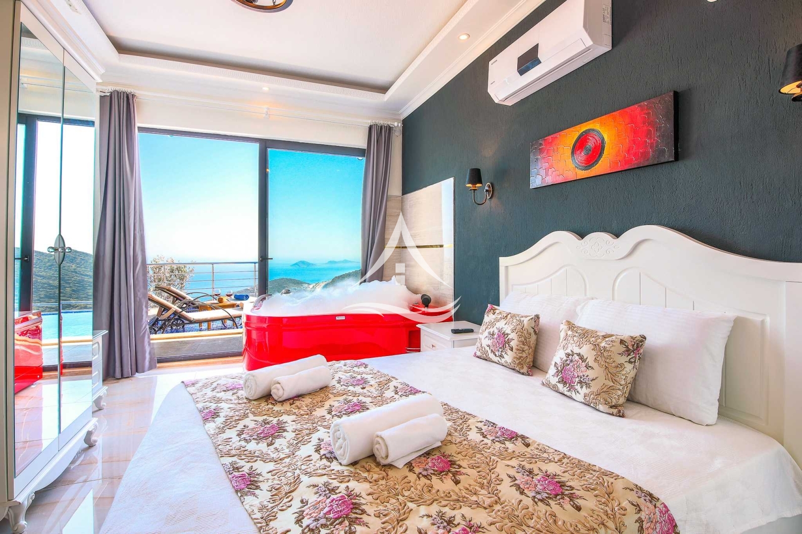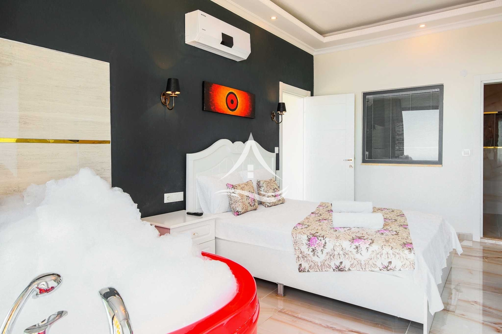 1. Yatak Odası : 1 Adet Çift Kişilik Yatak, Klima, Ebeveyn Banyo, Jakuzi