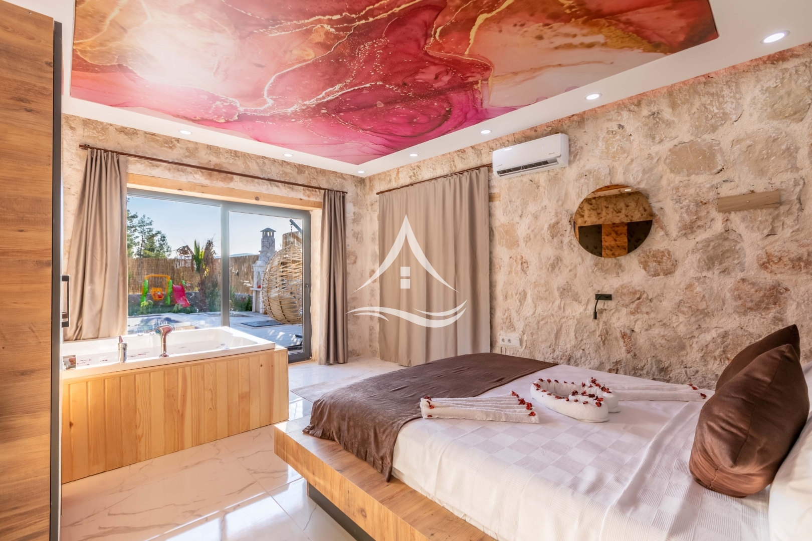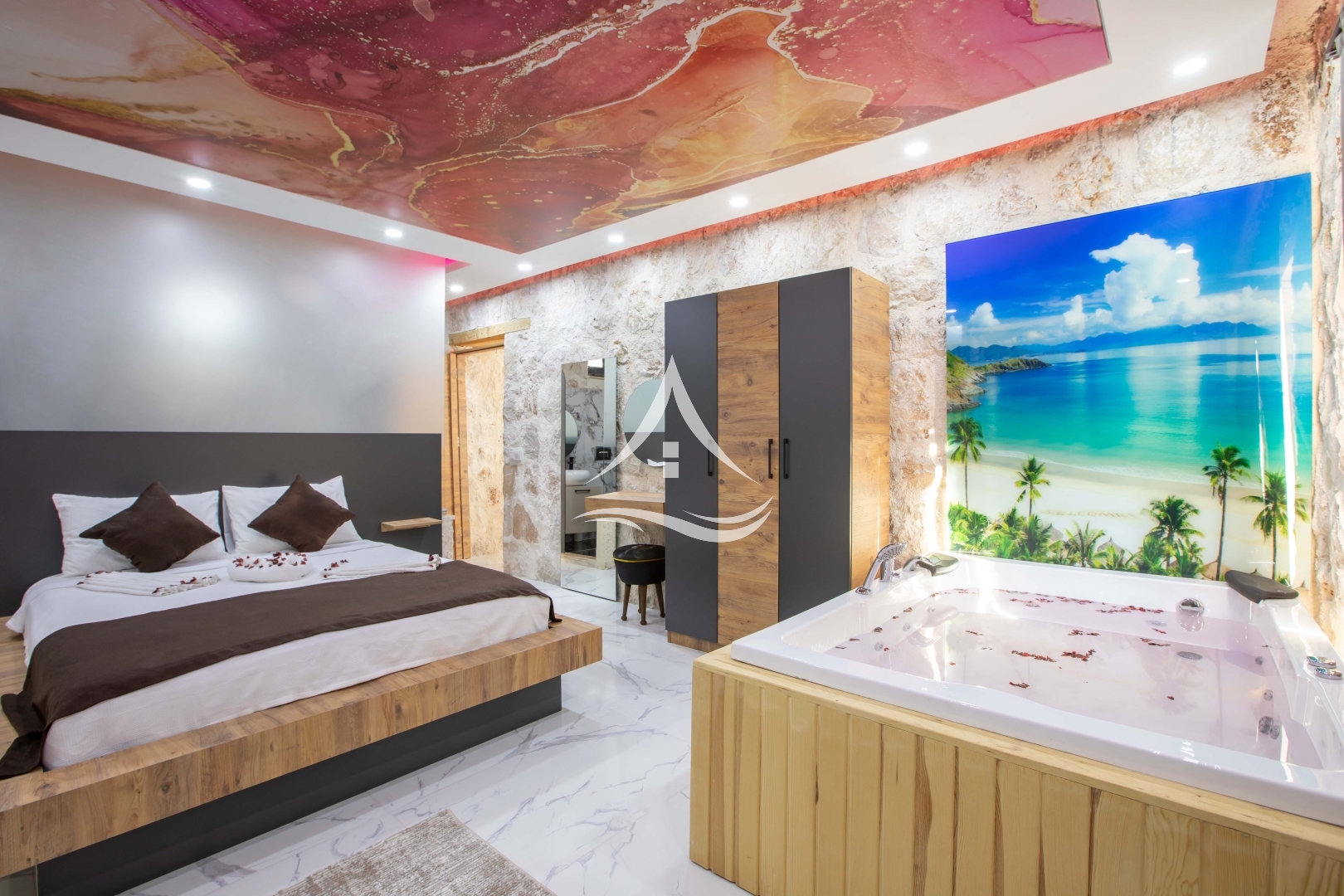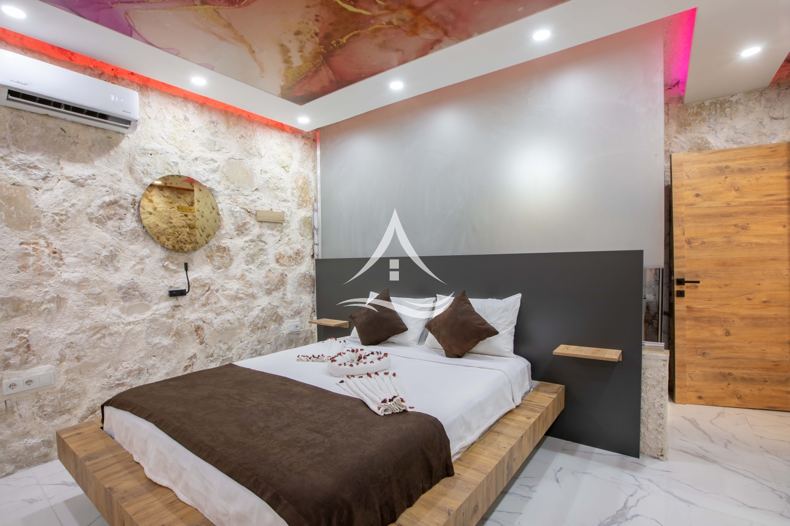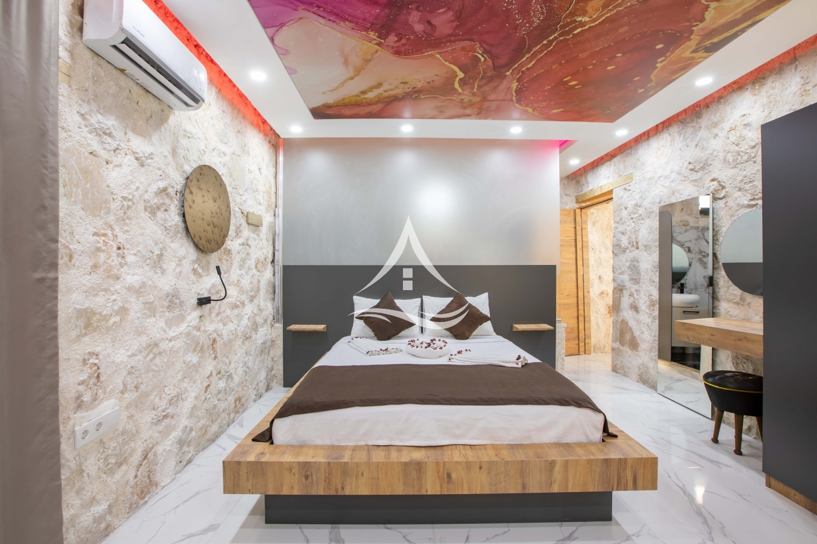 1. Yatak Odası : 1 Adet Çift Kişilik Yatak, Klima, Elbise Dolabı, Makyaj Masası , ,Ebeveyn Banyo , Jakuzi