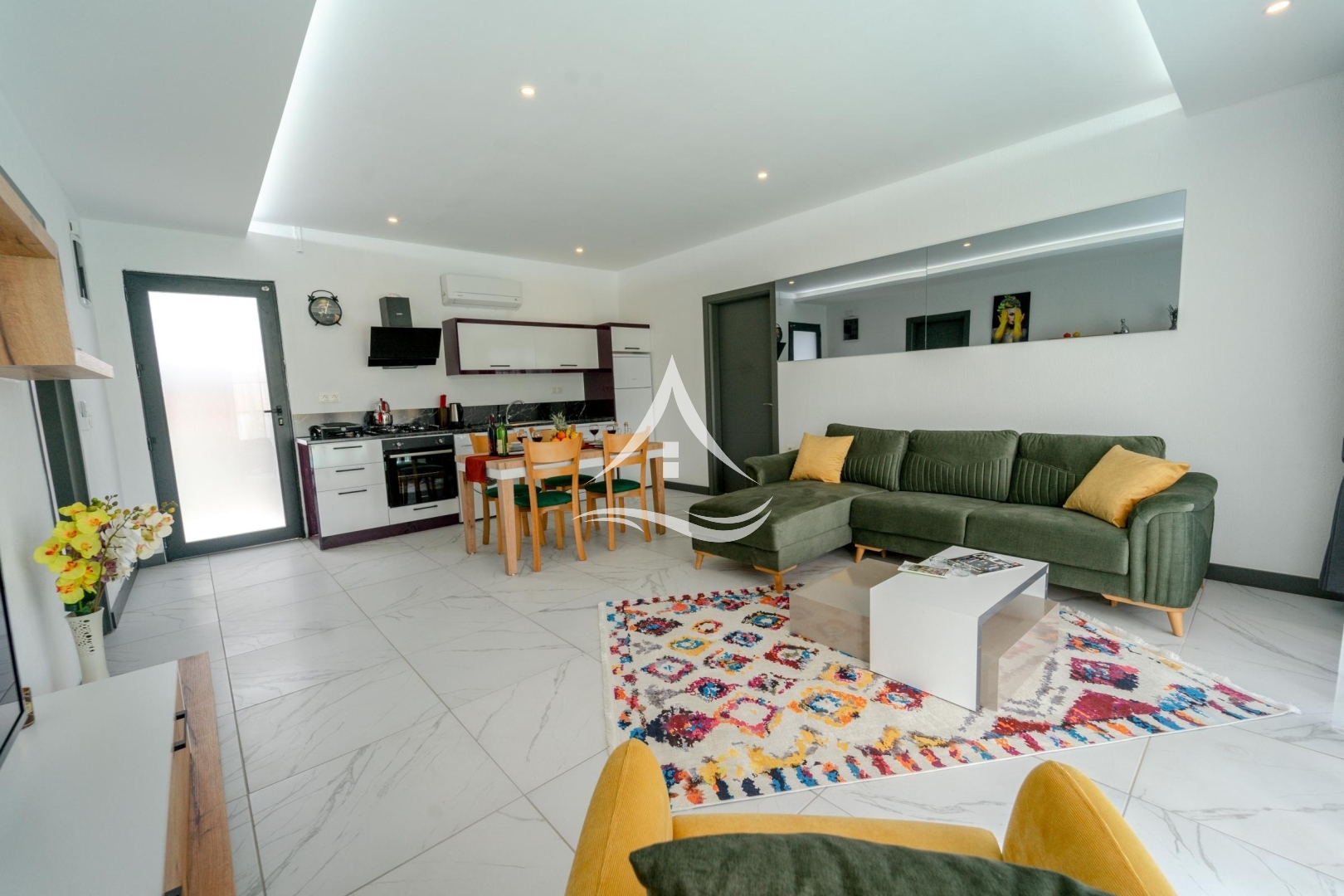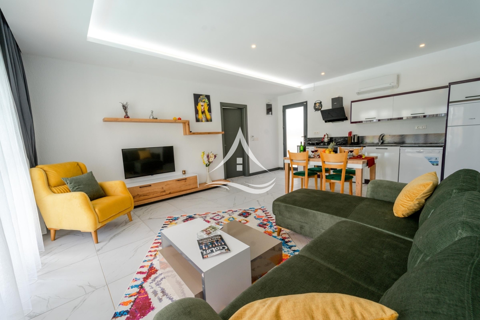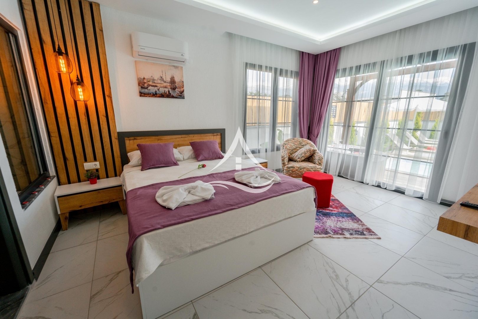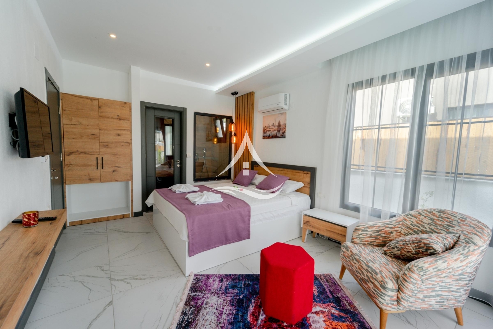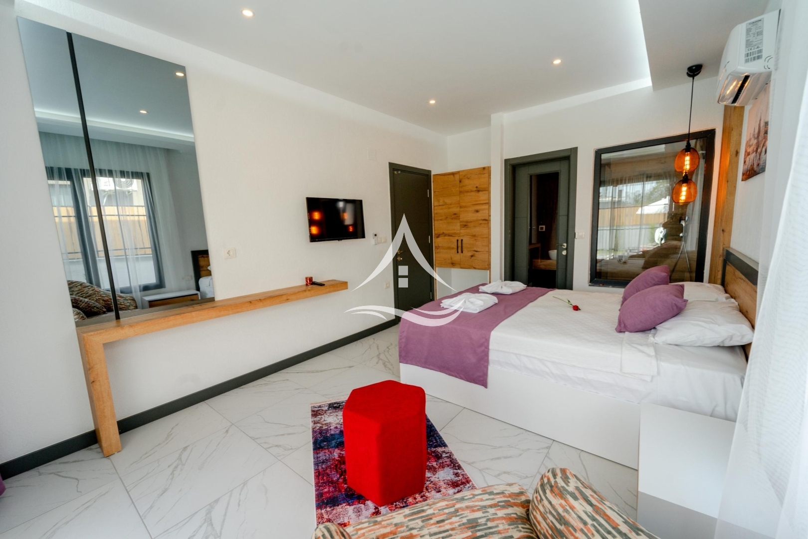 1. Yatak Odası : 1 Adet Çift Kişilik Yatak, Komodin, Elbise Dolabı, Makyaj Masası, Klima, Berjer, Ebeveyn Banyo