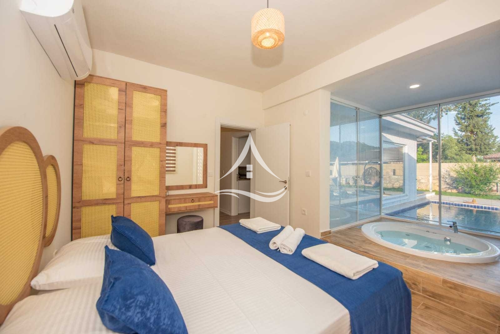 1. Yatak Odası : 1 Adet Çift Kişilik Yatak, Klima, Ebeveyn Banyo, Jakuzi