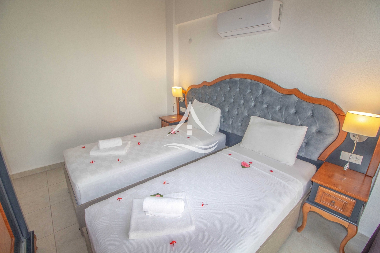 2.Yatak Odası : 2 Adet Tek Kişilik Yatak, Gardrop, Komodin, Banyo (Salonla ortak) ve havuz terasına geçiş imkanı