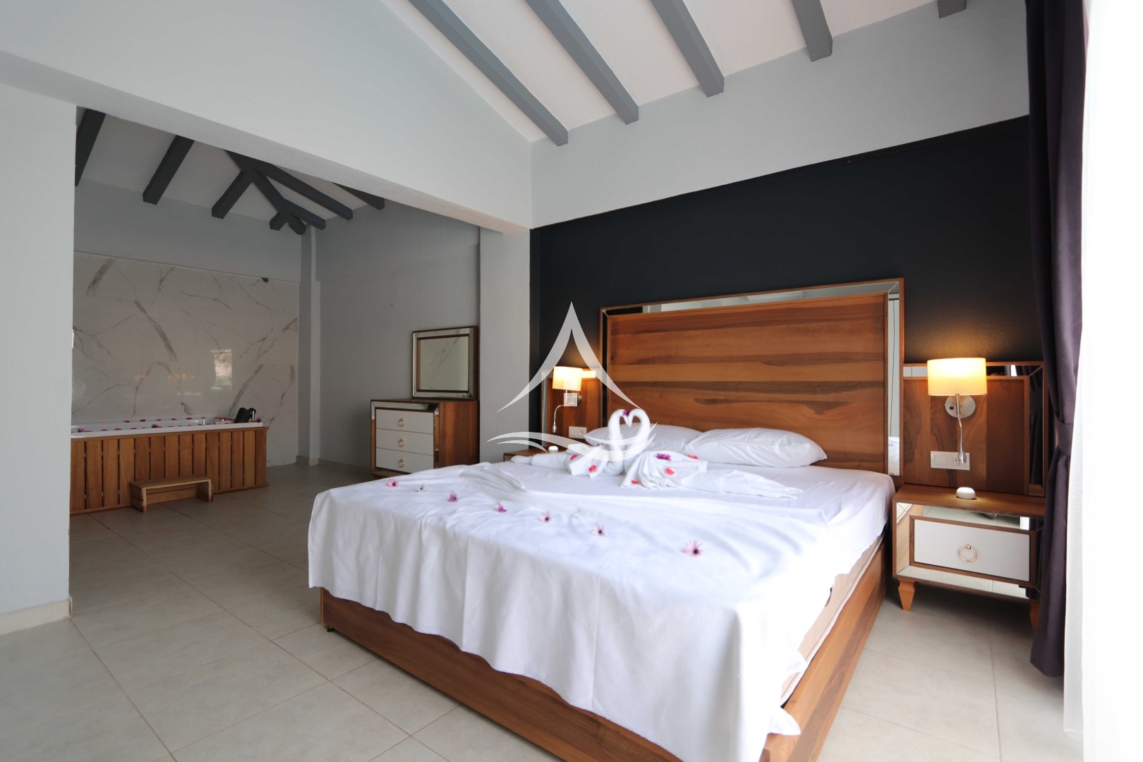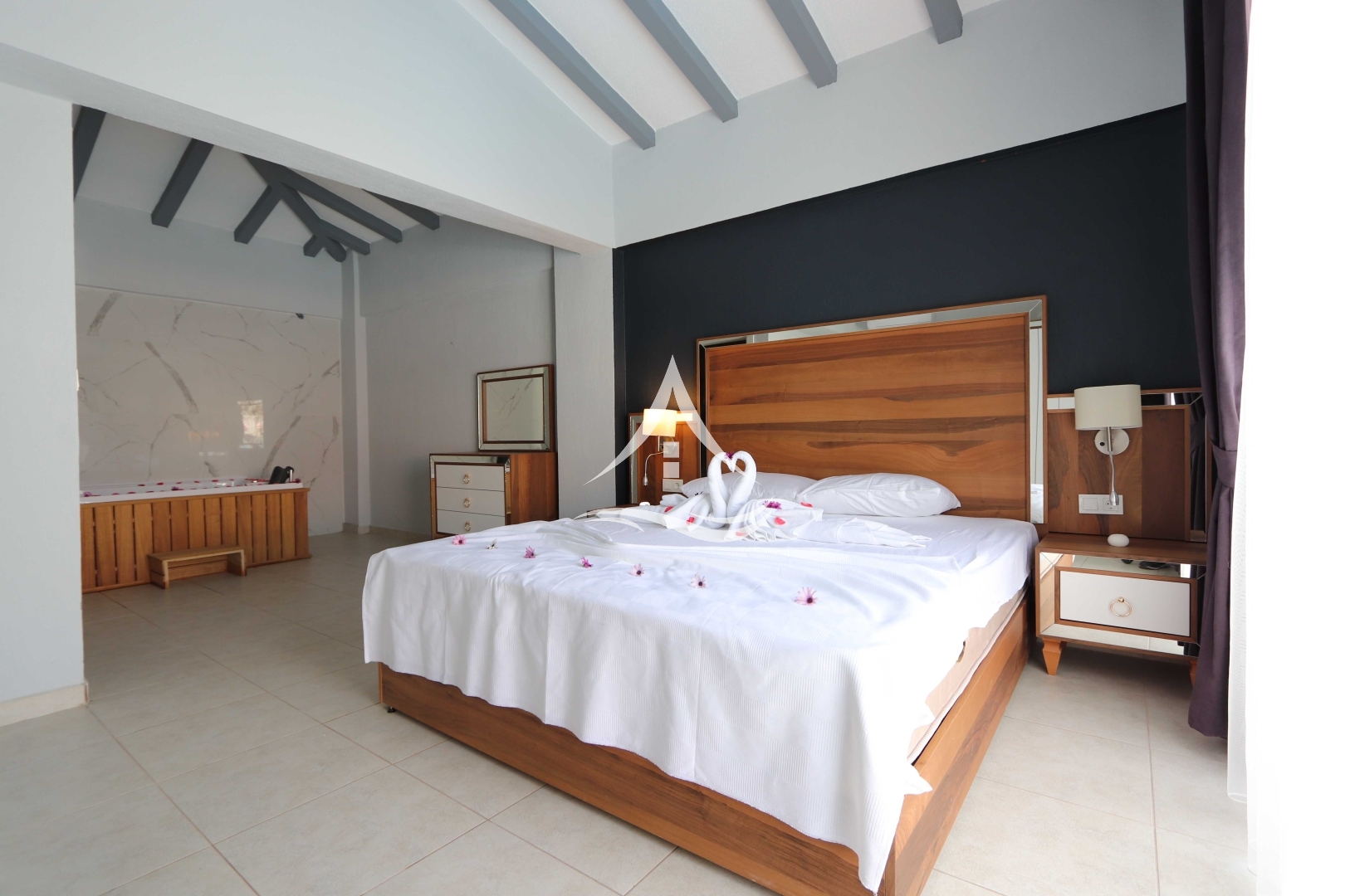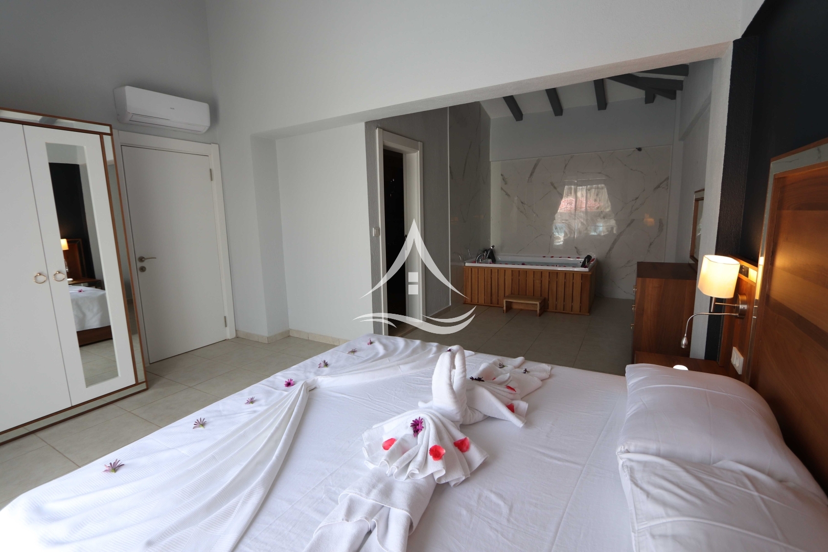 1.Yatak Odası : 1 Adet Çift Kişilik Yatak, Jakuzi, Ebeveyn Banyosu, Komodin, Makyaj Masası ve Gardrop