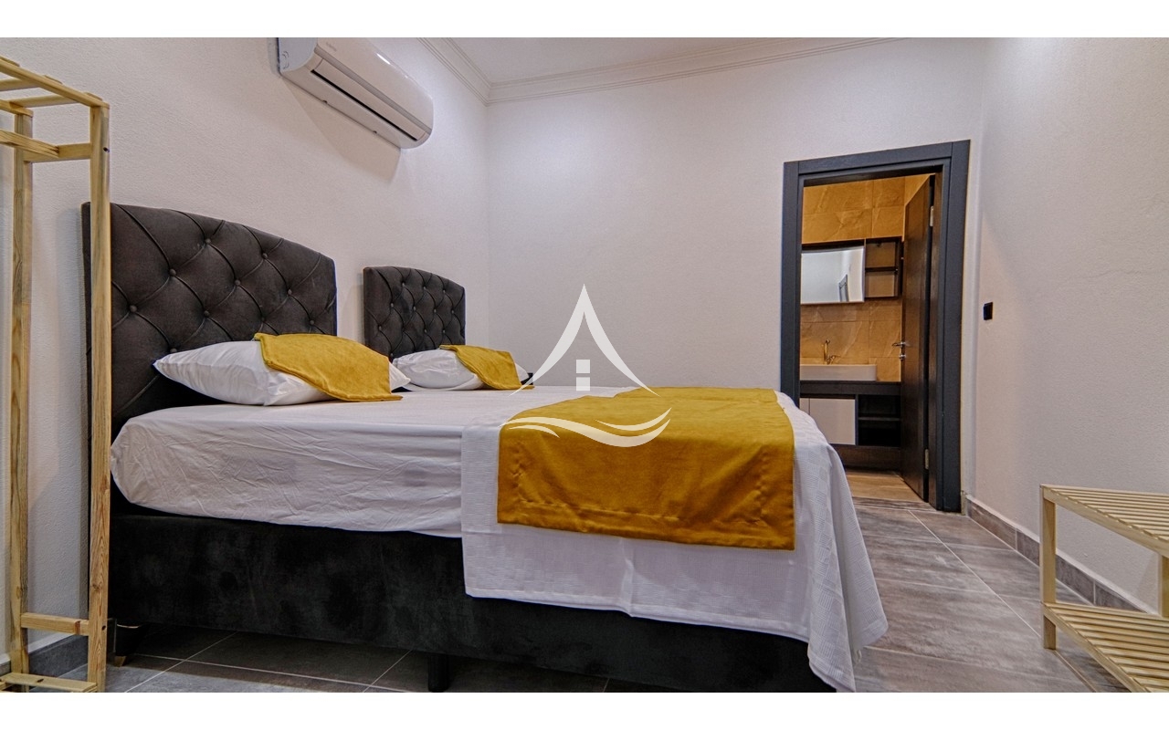 1. Yatak Odası : 1 Adet Çift Kişilik Yatak, Klima, Komodin , Açık Elbise Dolabı,  Ebeveyn Banyo
