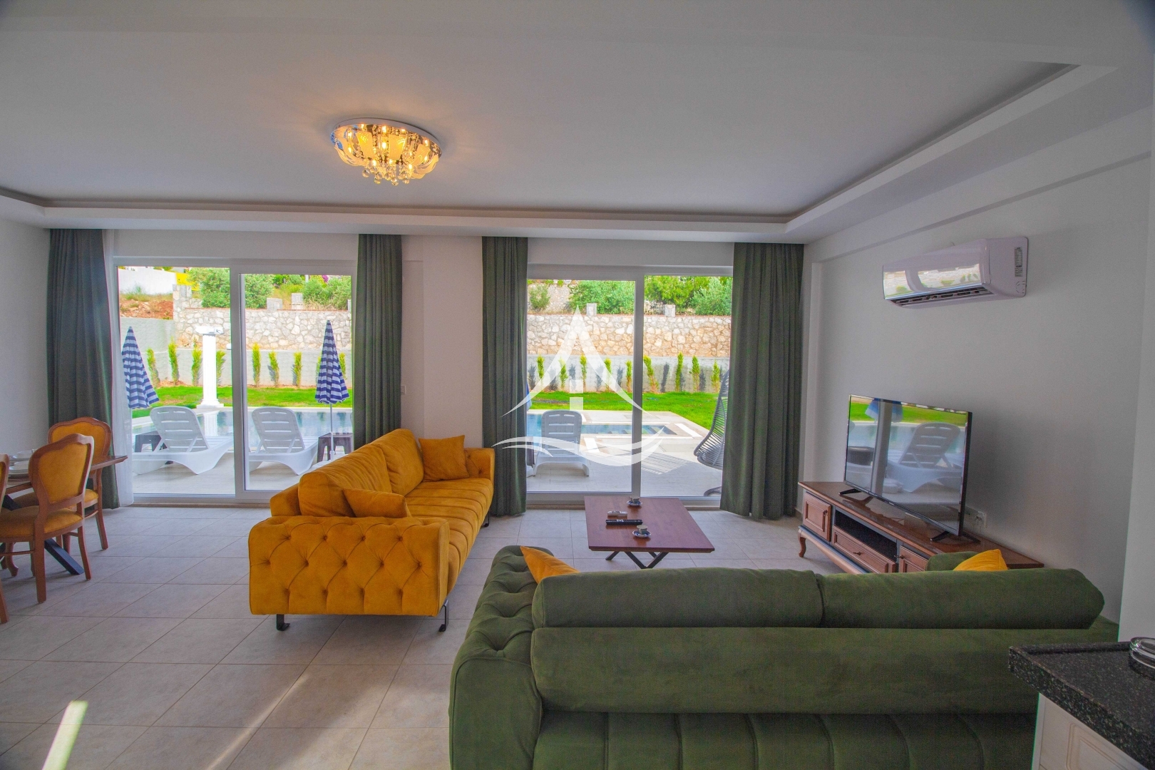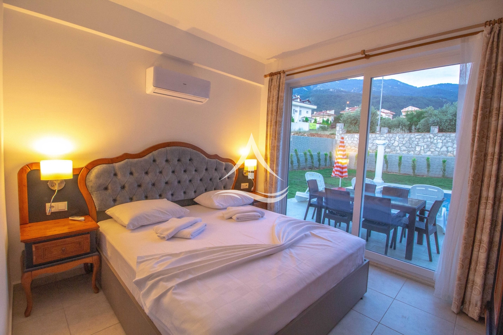 1.Yatak Odası : 1 Adet Çift Kişilik Yatak, Komodin, Klima, Gardrop, Banyo(ortak) ve havuz terasına çıkış