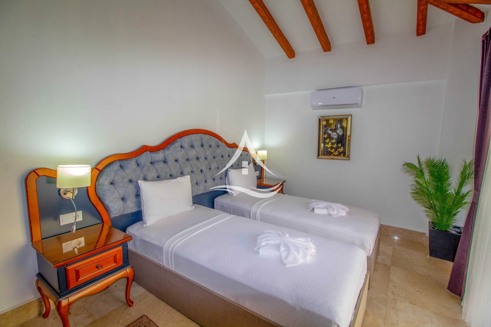 Detayları : 2 adet tek kişilik yatak, gardrop, komodin, Banyo (salonla ortak) ve havuz terasına geçiş imkanı