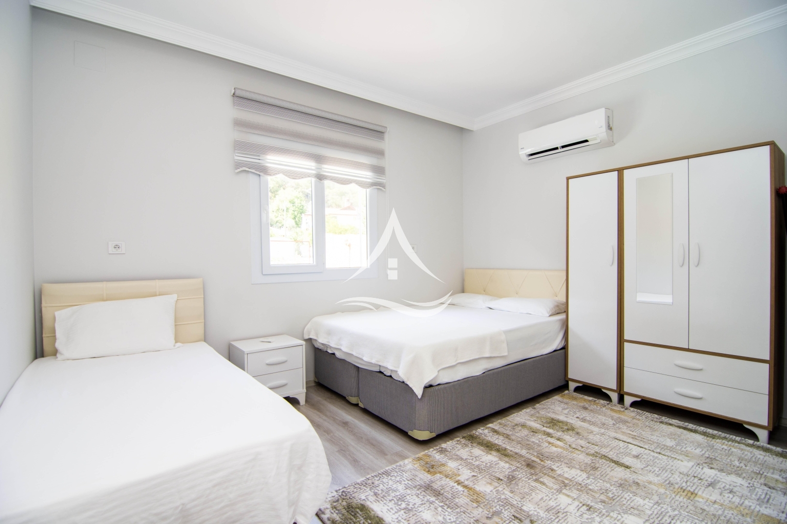 2. Yatak Odası : 1 Adet Çift Kişilik Yatak,1 Adet Tek Kişilik Yatak, Klima, Elbise Dolabı, Komodin, Ortak Kullanım Banyo