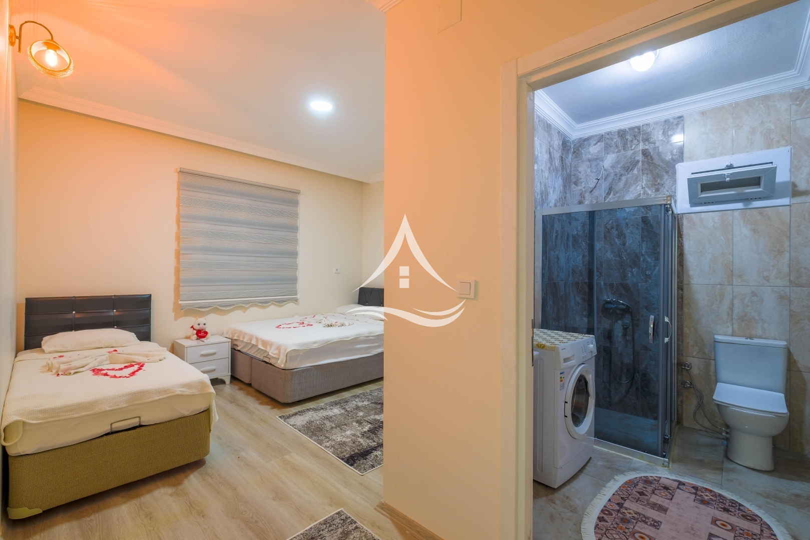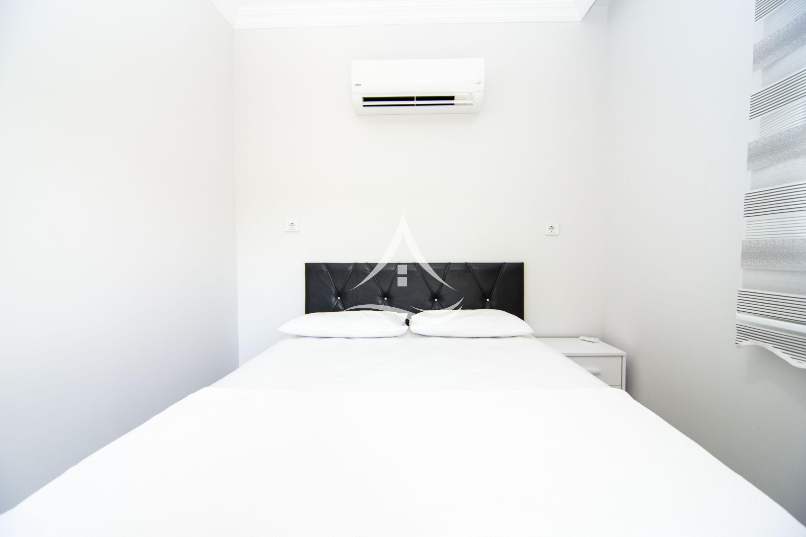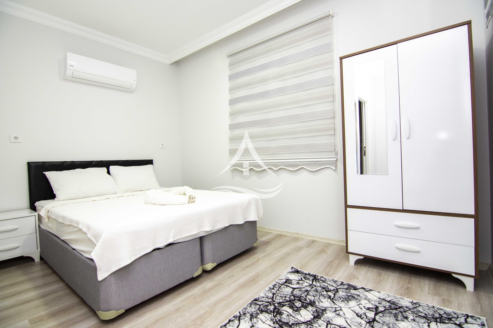 1. Yatak Odası : 1 Adet Çift Kişilik Yatak, Klima, Elbise Dolabı, Komodin, Ebeveyn Banyo