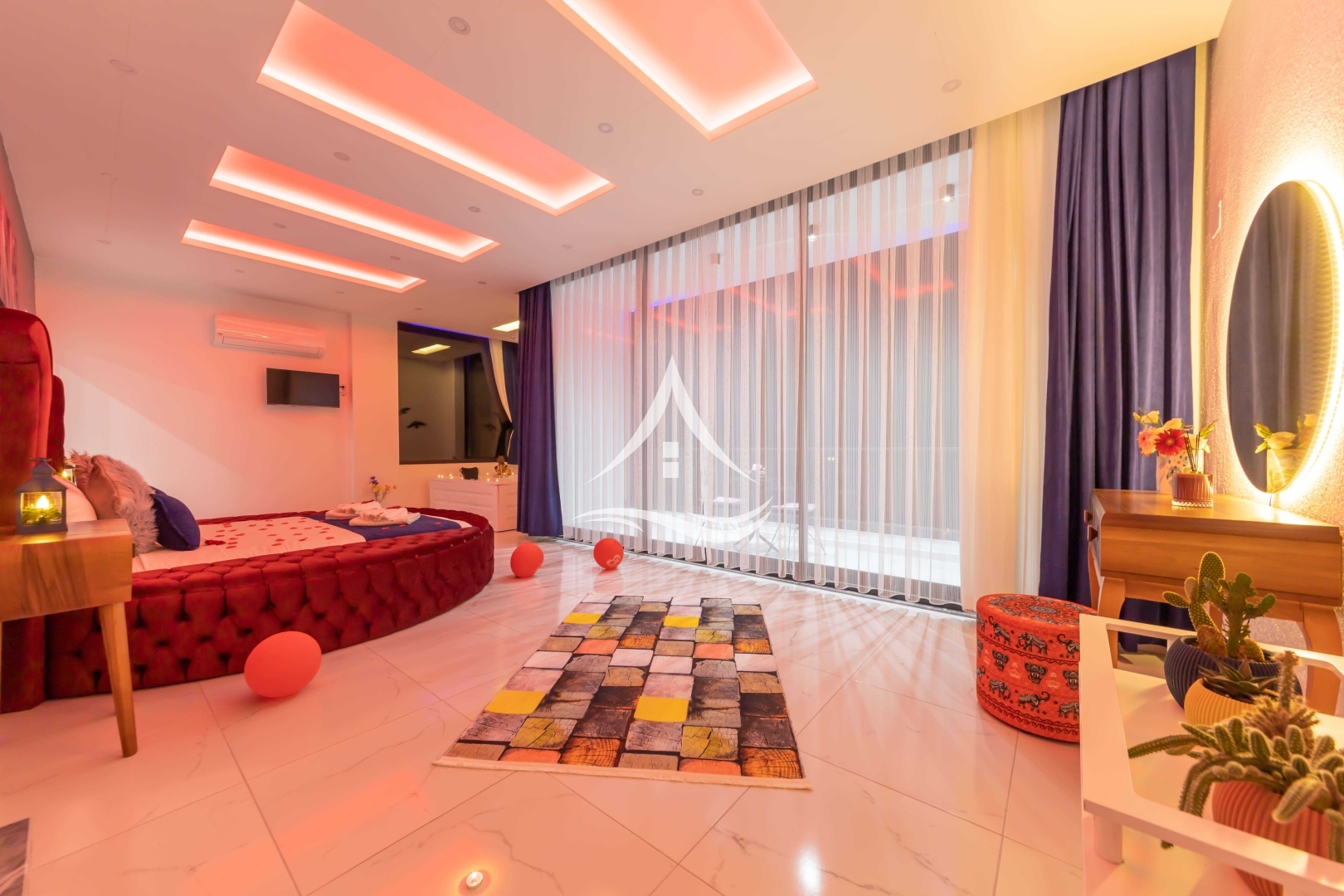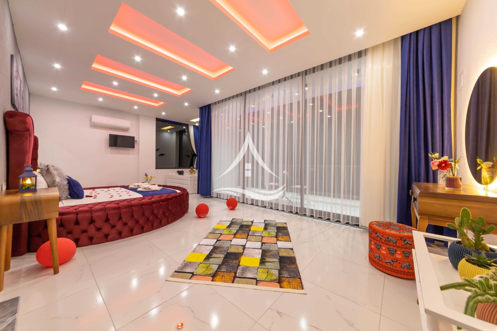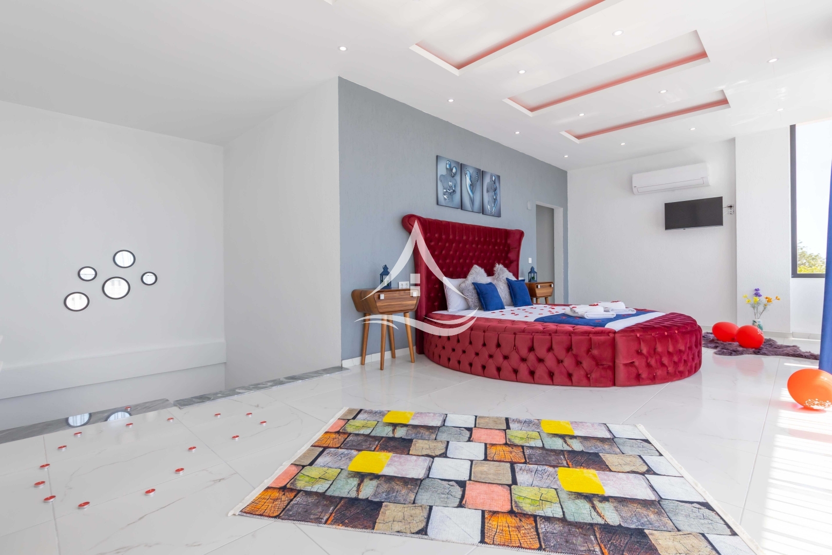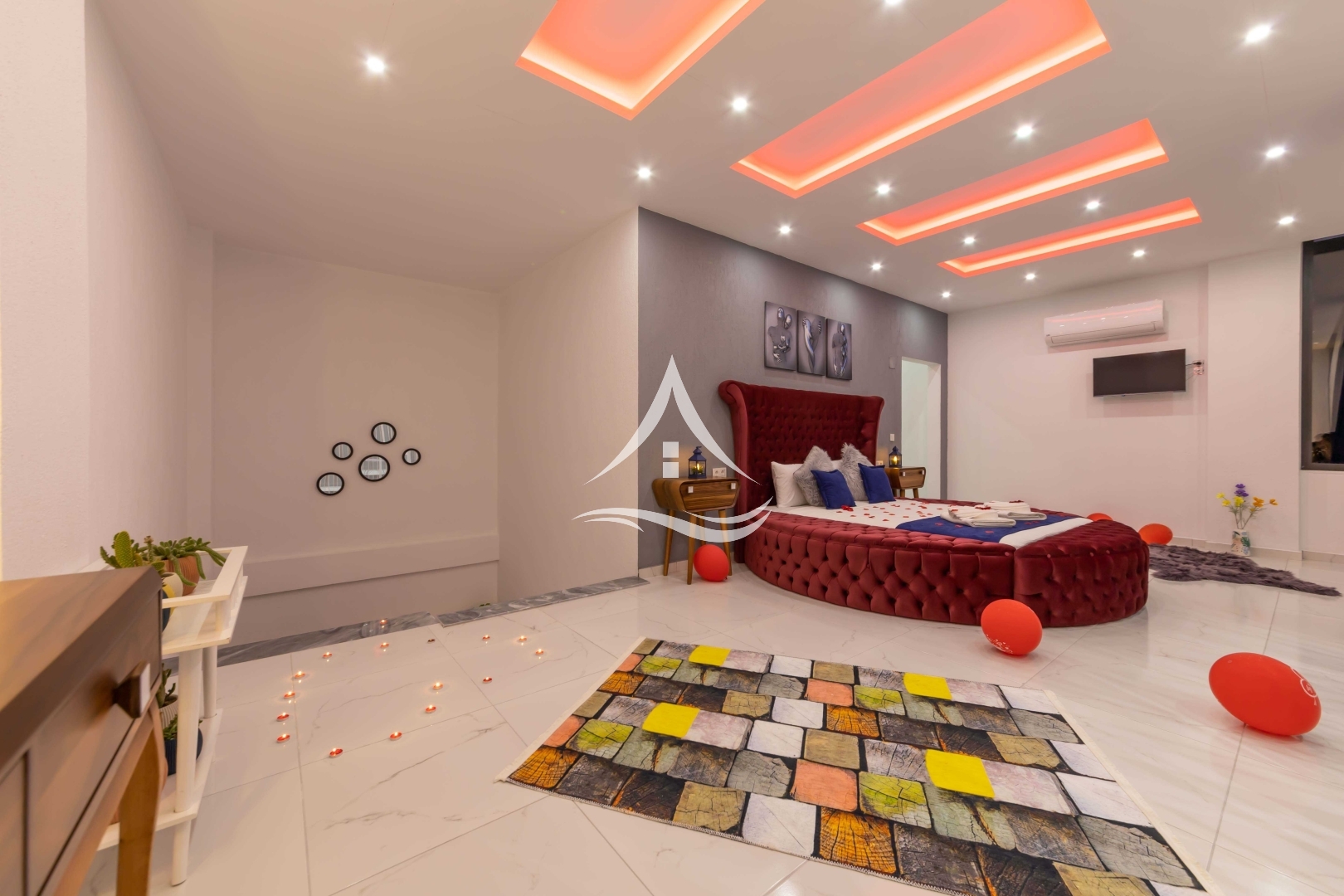 1.Yatak Odası: 1 Adet Çift Kişilik Yatak, Klima, Komodin, Makyaj masası, Elbise dolabı, Banyo, Jakuzi