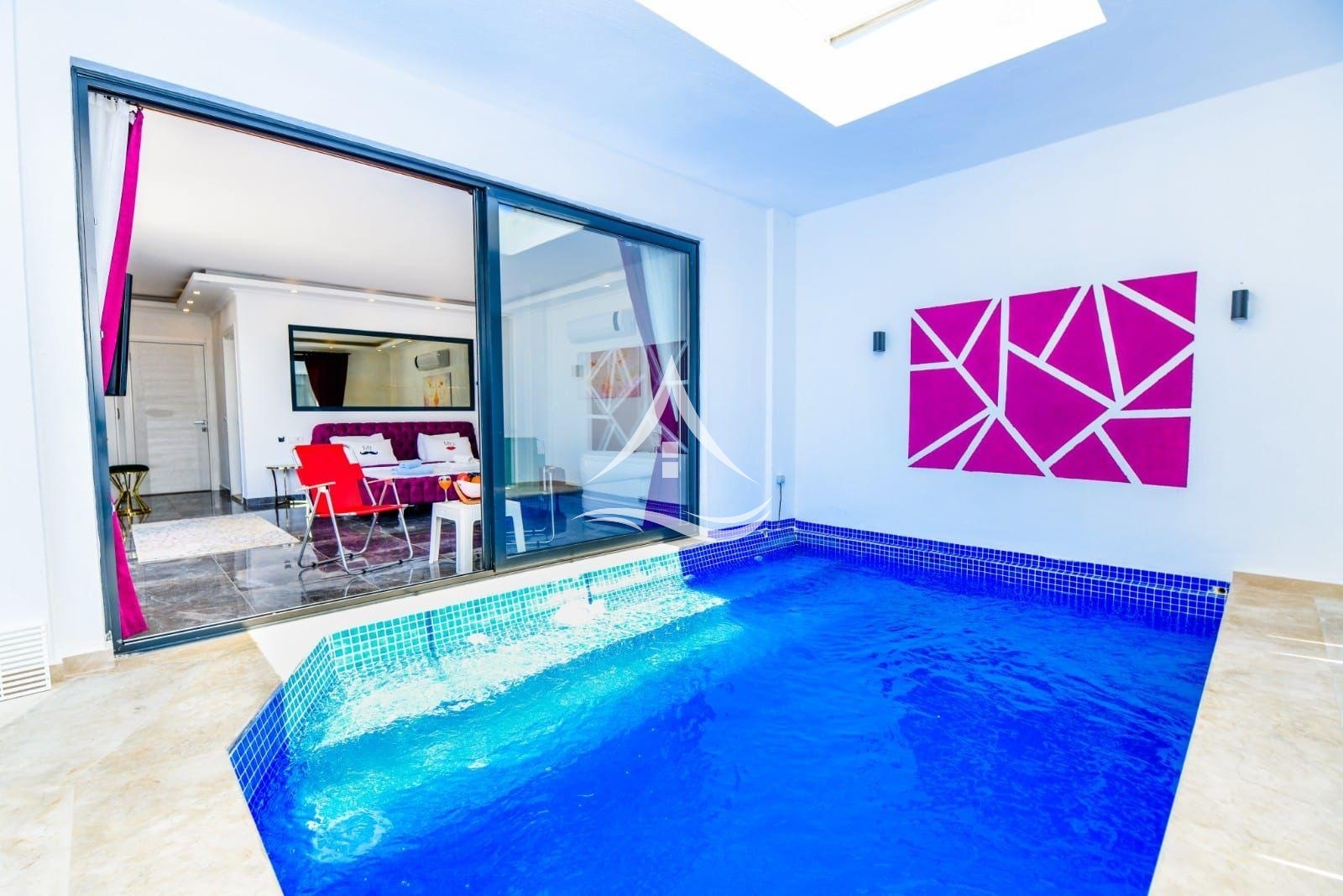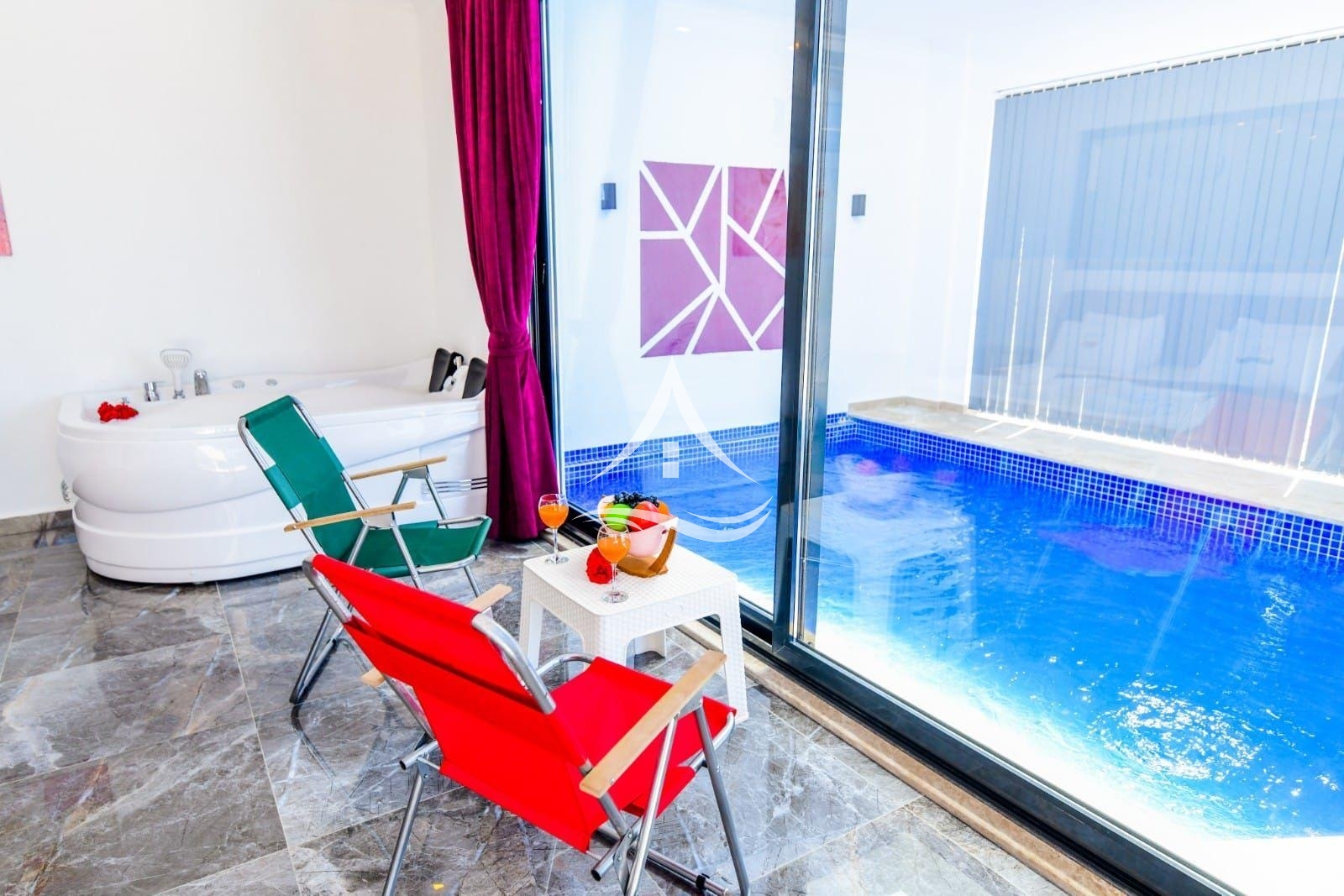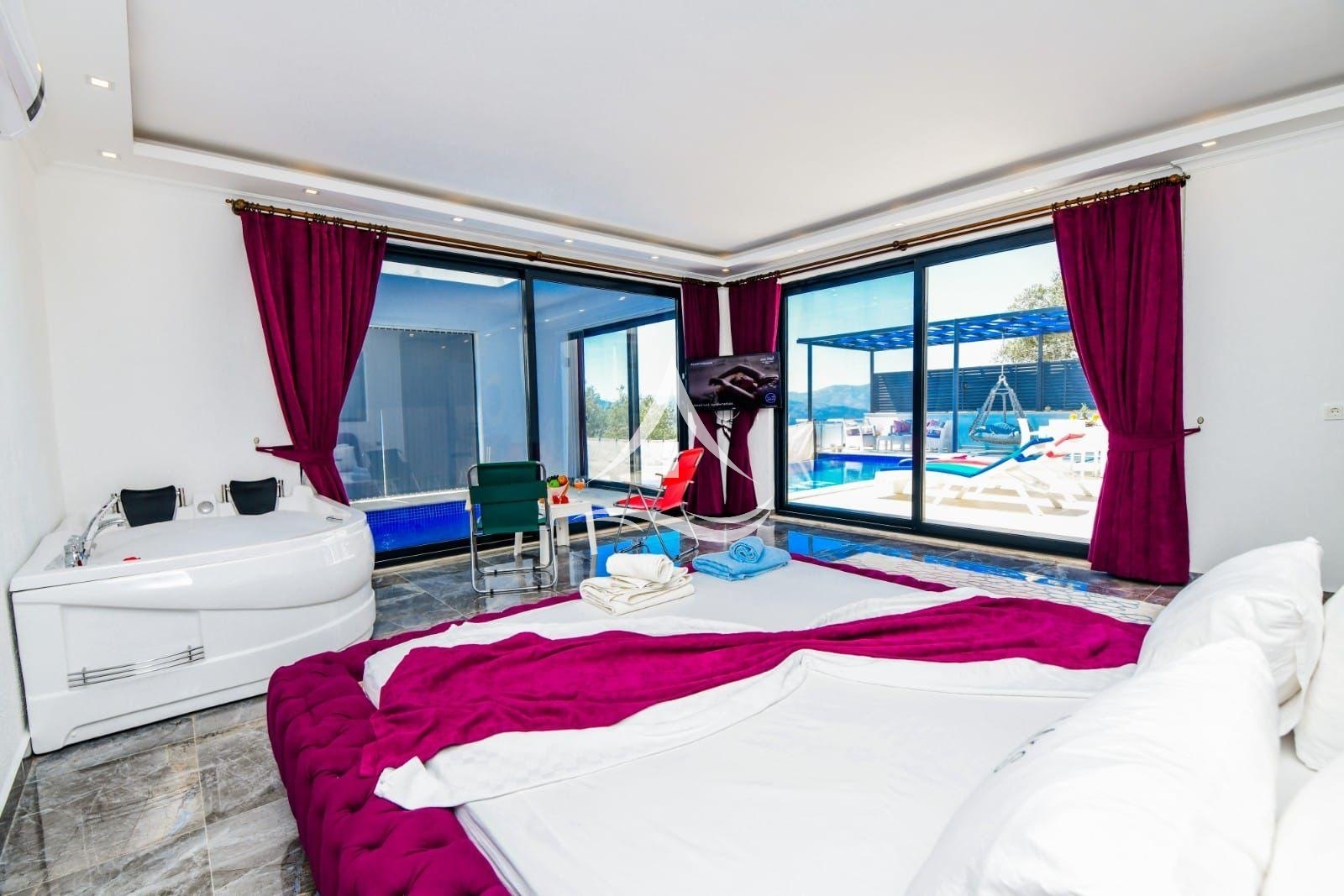 1. Yatak Odası : 1 Adet Çift Kişilik Yatak, Elbise Dolabı, Klima, Jakuzi , TV, Kapalı Havuz ,Ebeveyn Banyo